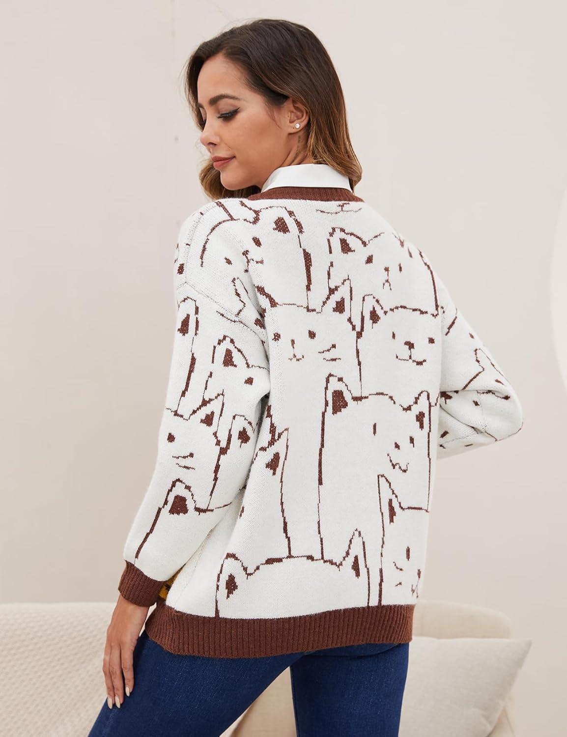 Arssm Cat Sweater for Women Oversized Button Down V Neck Knit Cardigan Cute Kawaii Cartoon Print Sweater Fall Clothes(Brown)