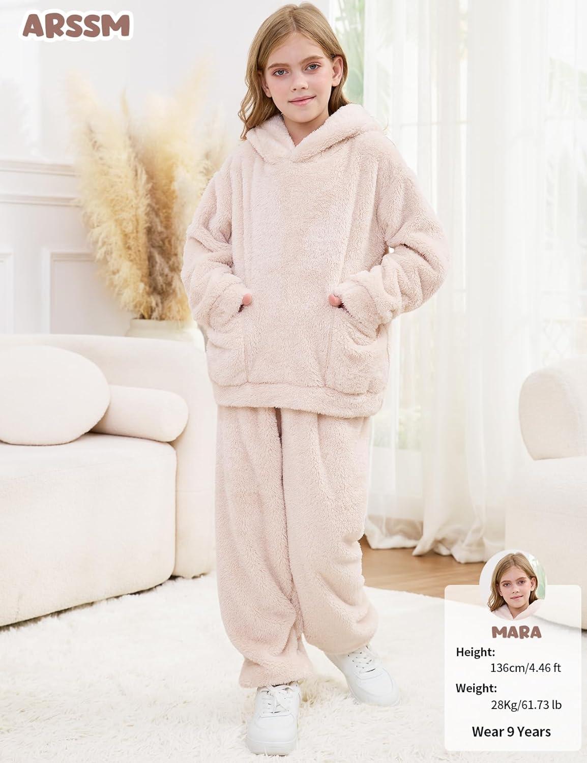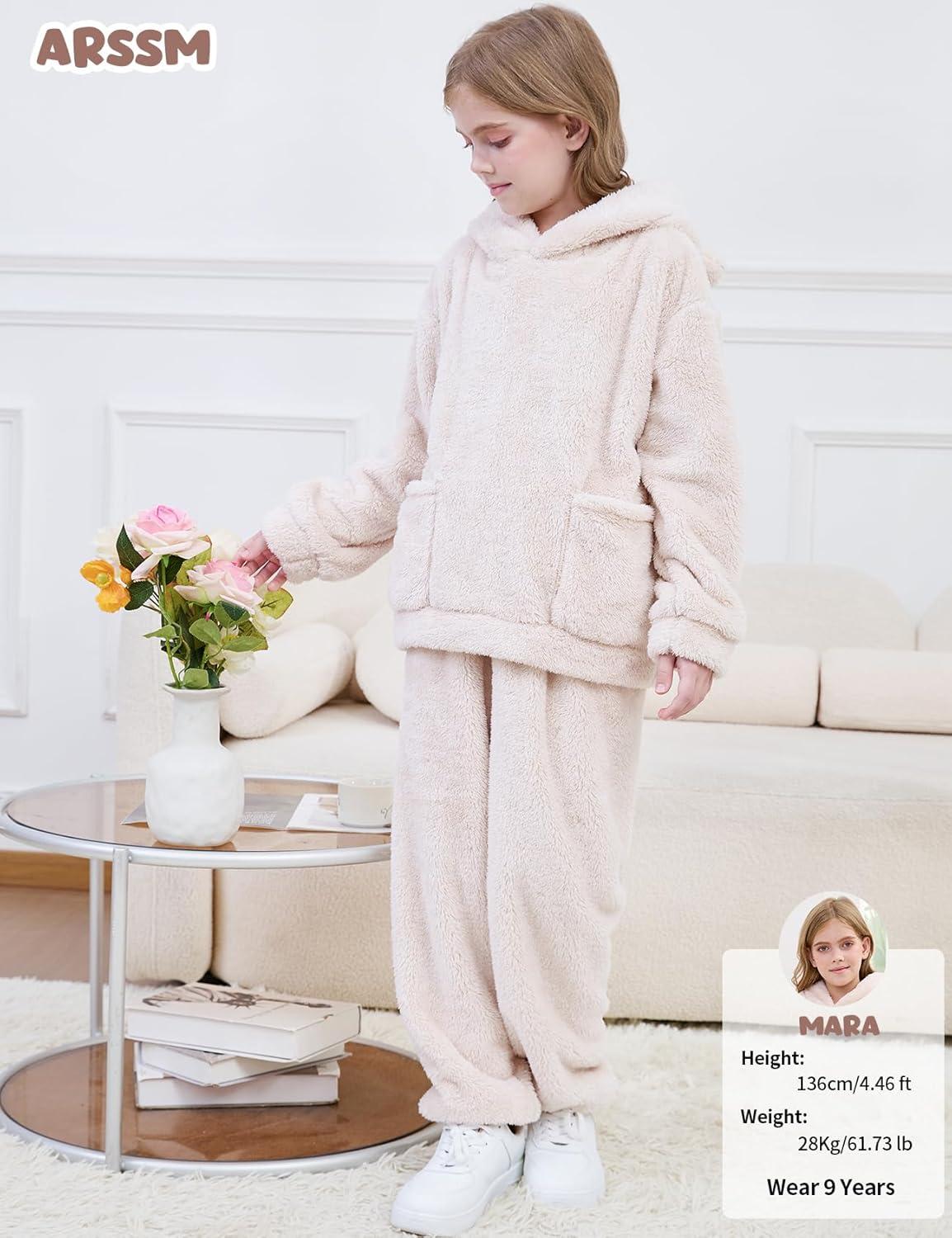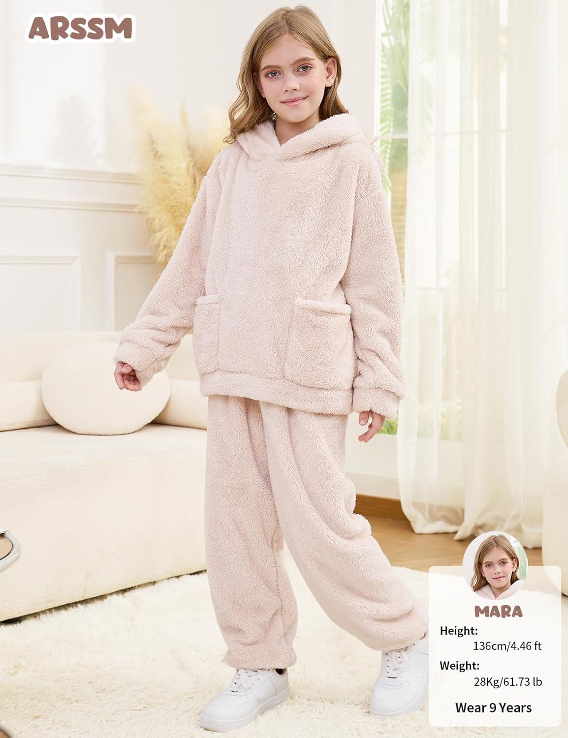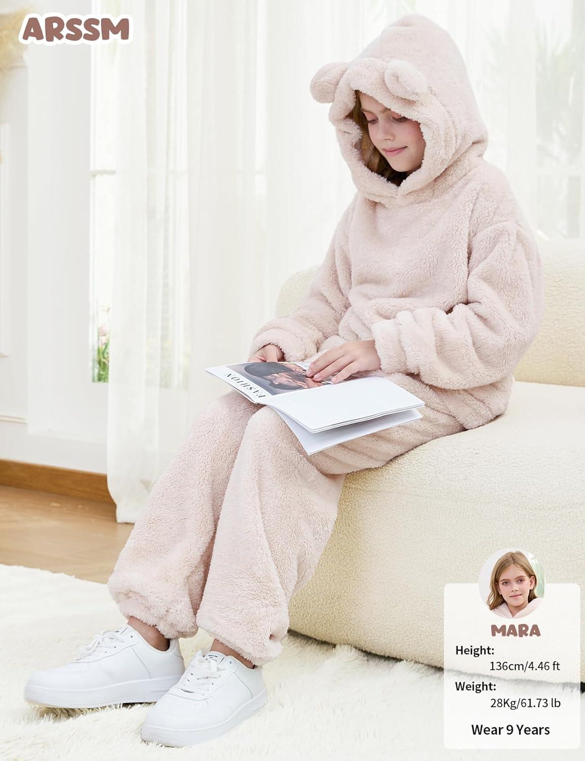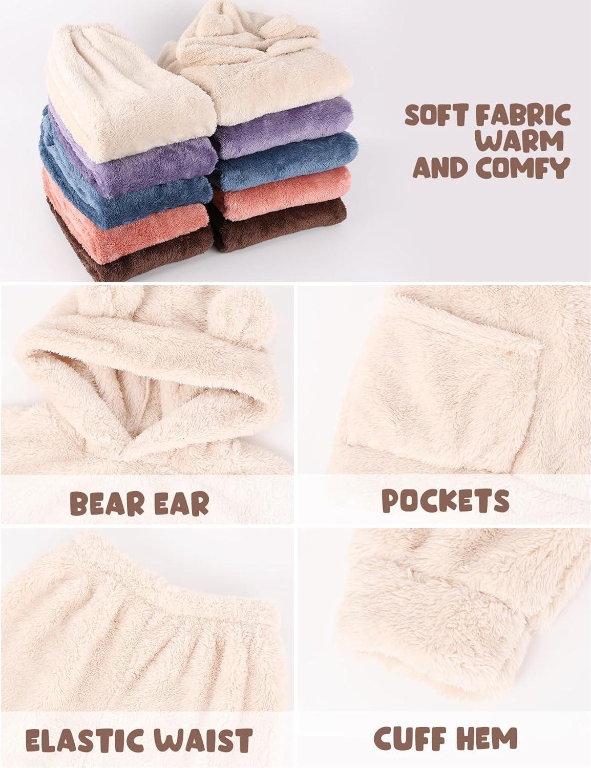 Arssm Girl Pants Sets Two Pieces Outfit Kids Bear Ear Fuzzy Fluffy Hoodie Sweatshirt with Fleece Sweatpants(Beige)