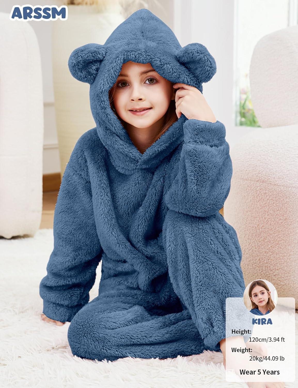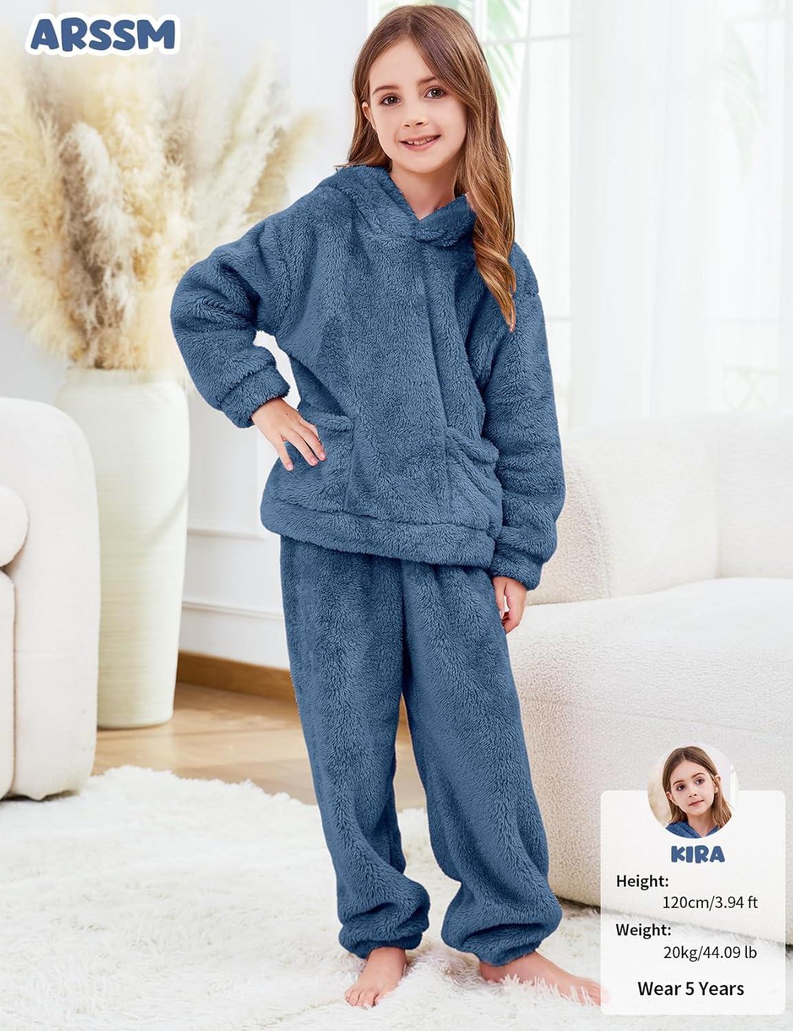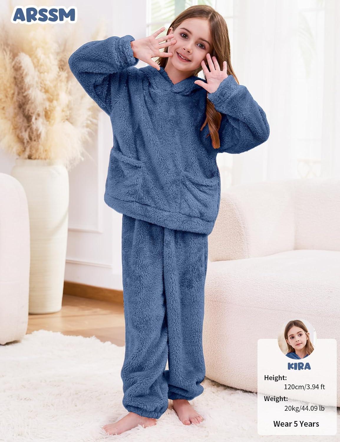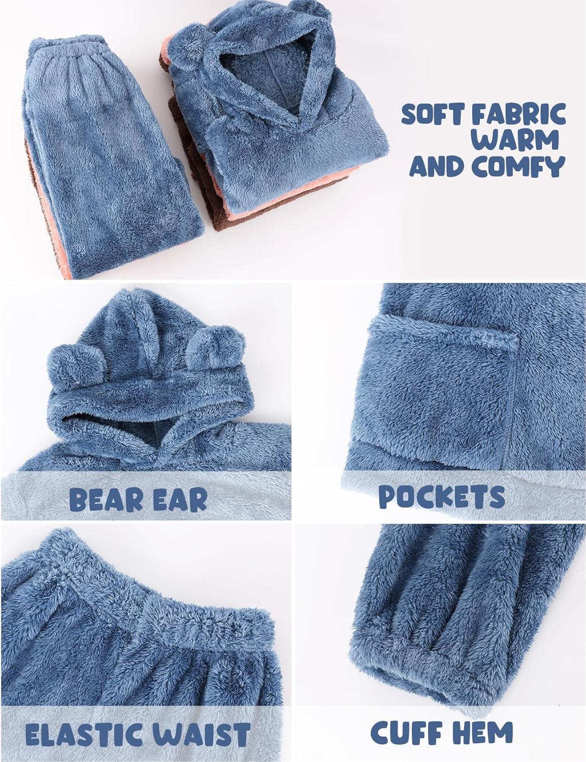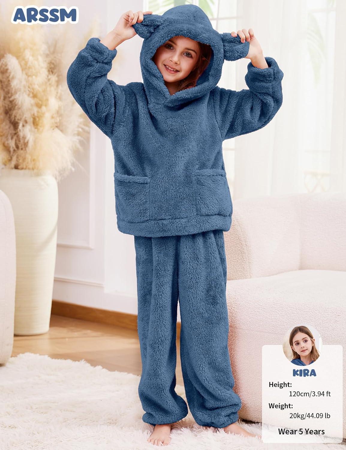 Arssm Girl Pants Sets Two Pieces Outfit Kids Bear Ear Fuzzy Fluffy Hoodie Sweatshirt with Fleece Sweatpants(Blue)