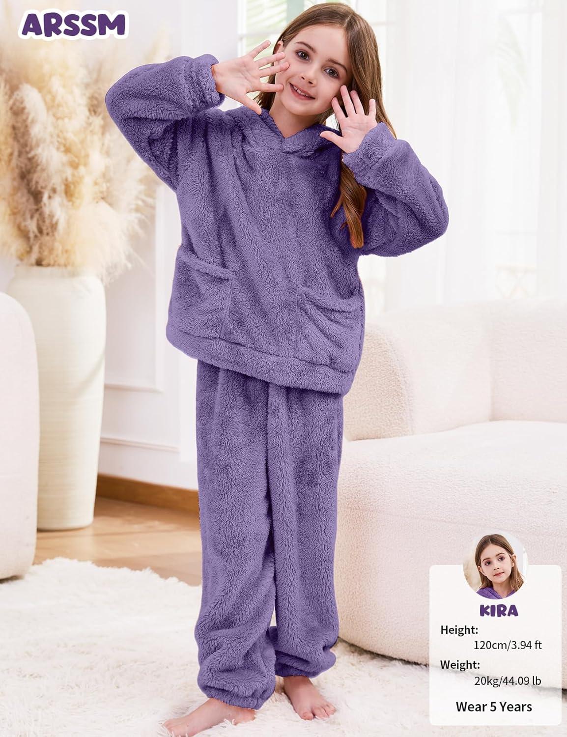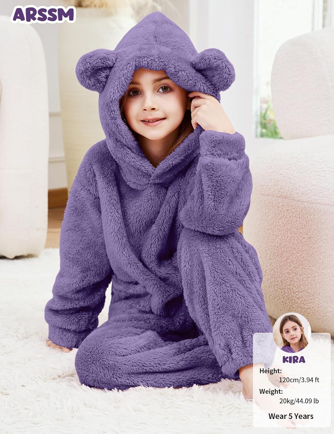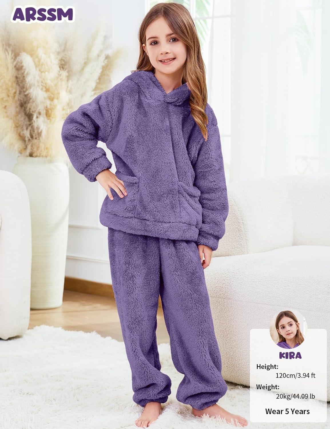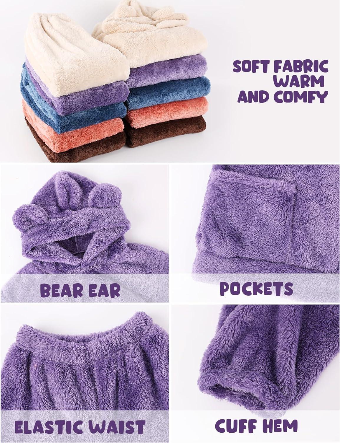 Arssm Girl Pants Sets Two Pieces Outfit Kids Bear Ear Fuzzy Fluffy Hoodie Sweatshirt with Fleece Sweatpants(Purple)