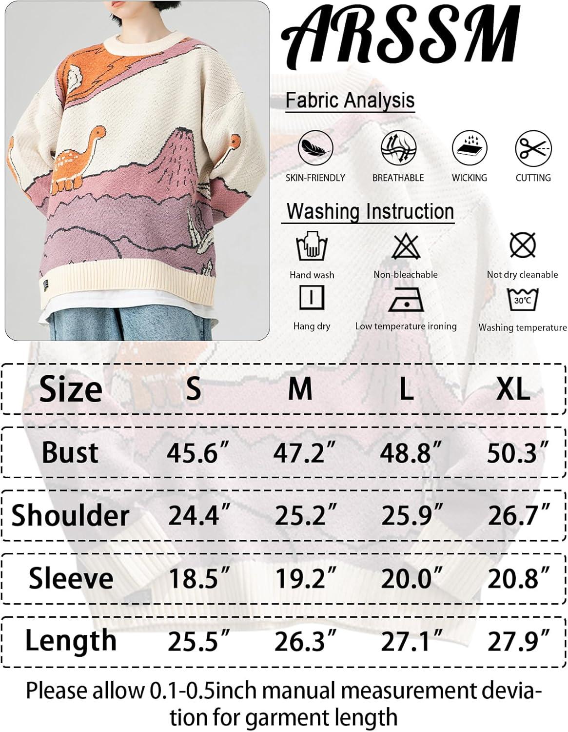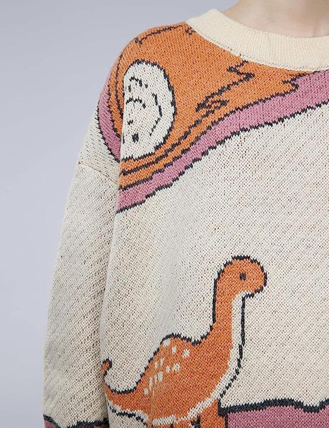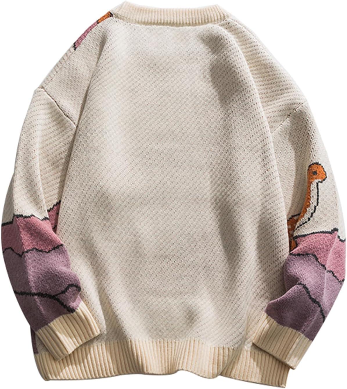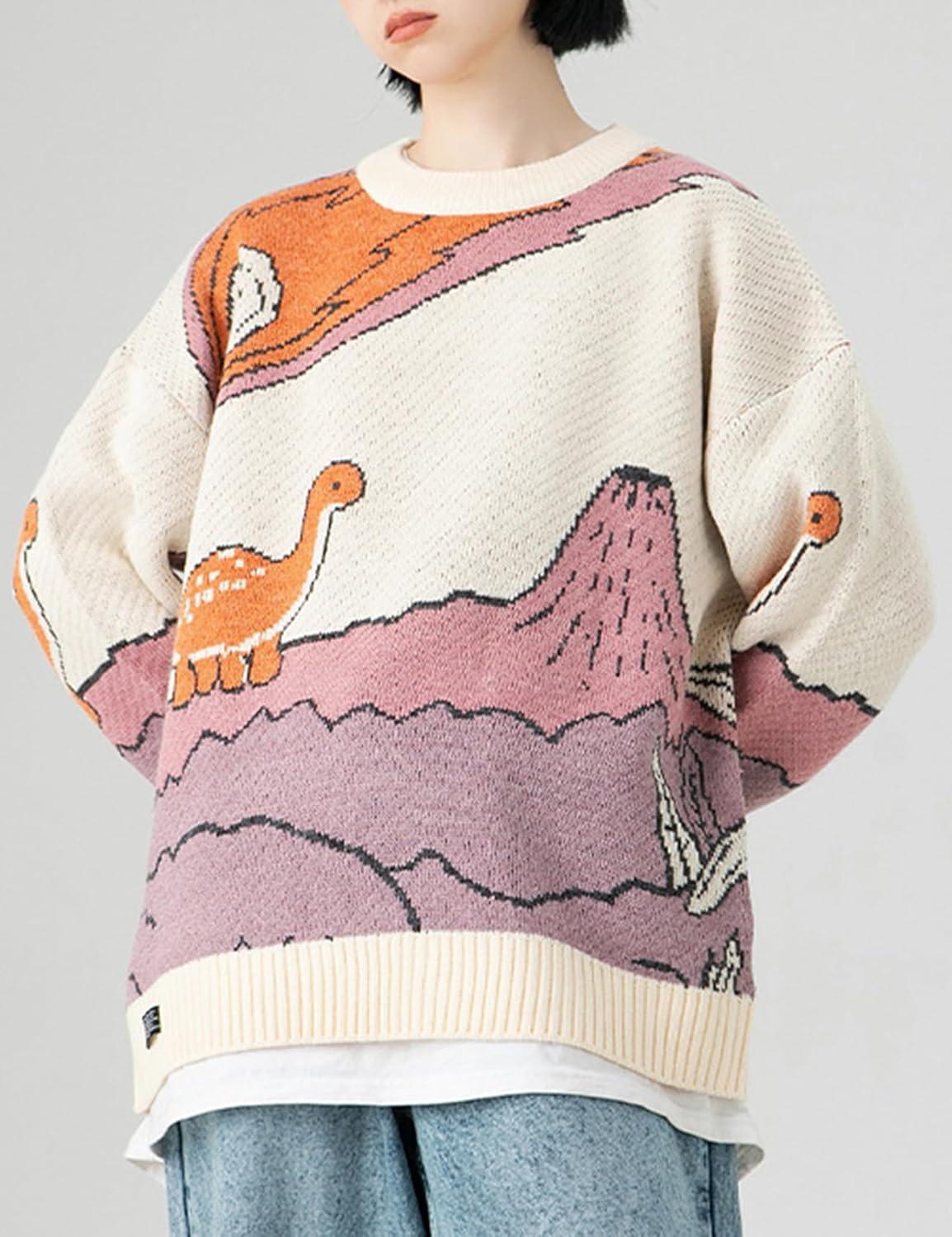 Arssm Mens Oversized Dinosaur Knit Pullover Sweater Fashion Cartoon Unisex Sweater Long Sleeve Crewneck Vintage Tops(Beige)