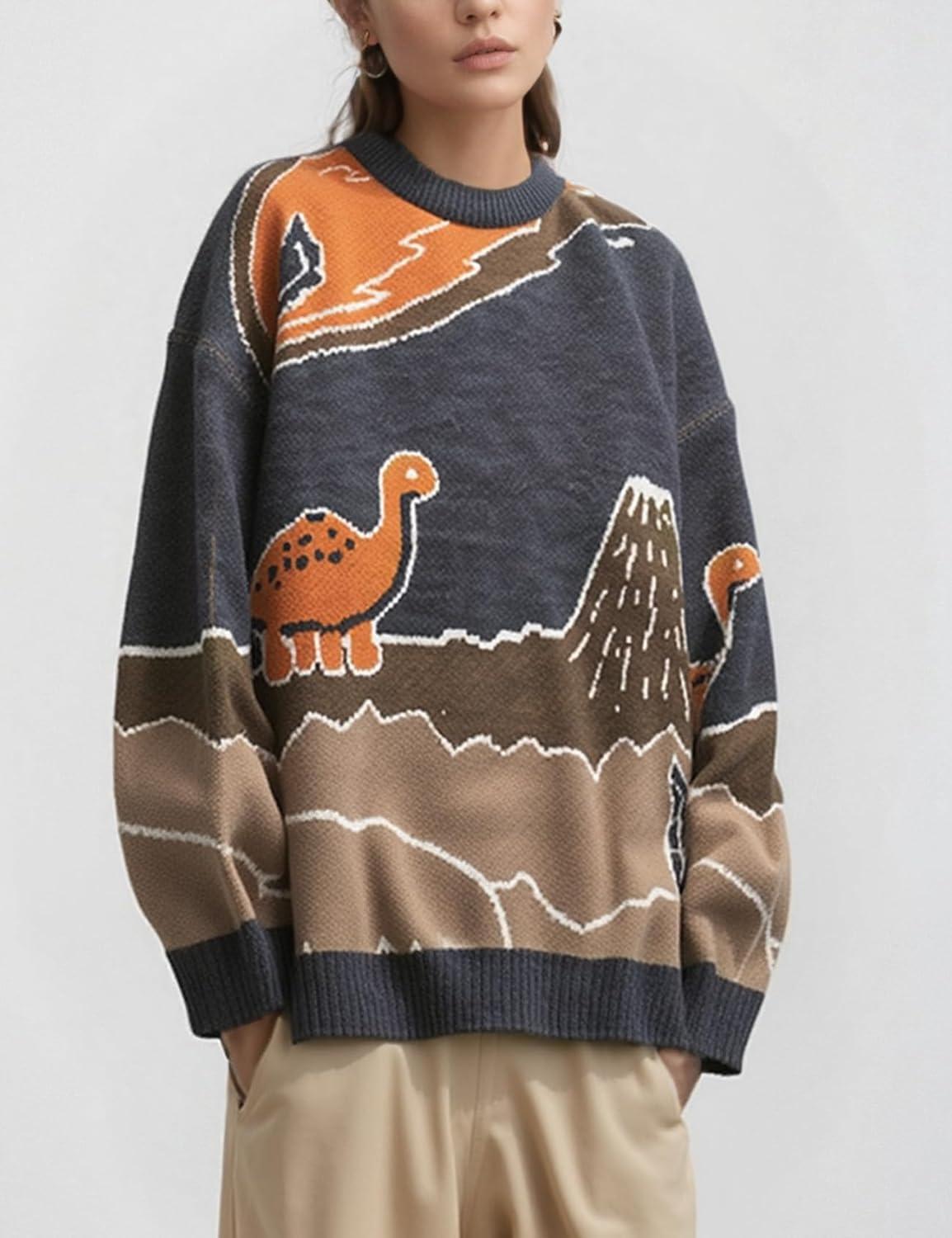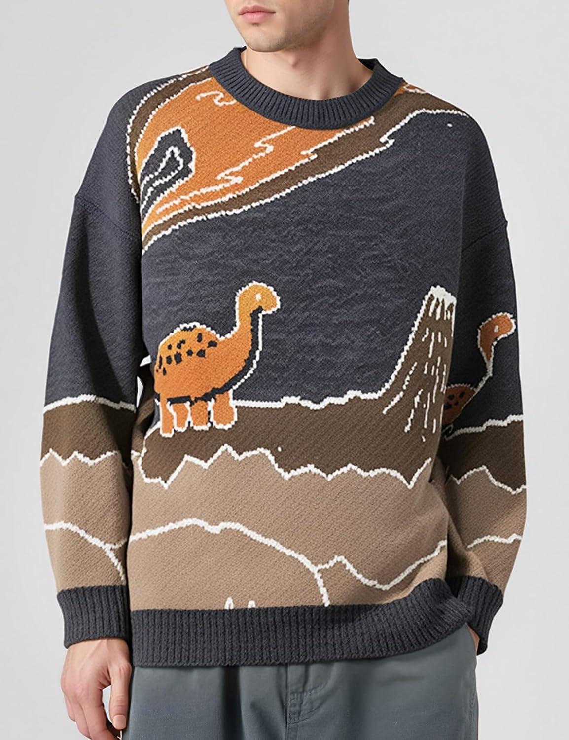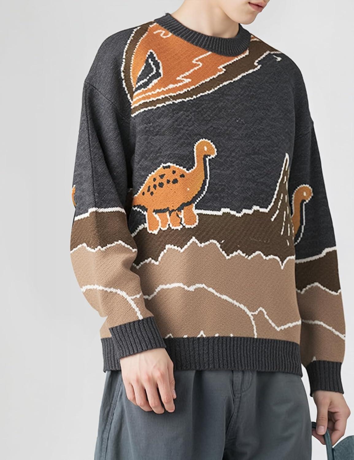 Arssm Mens Oversized Dinosaur Knit Pullover Sweater Fashion Cartoon Unisex Sweater Long Sleeve Crewneck Vintage Tops(Grey)