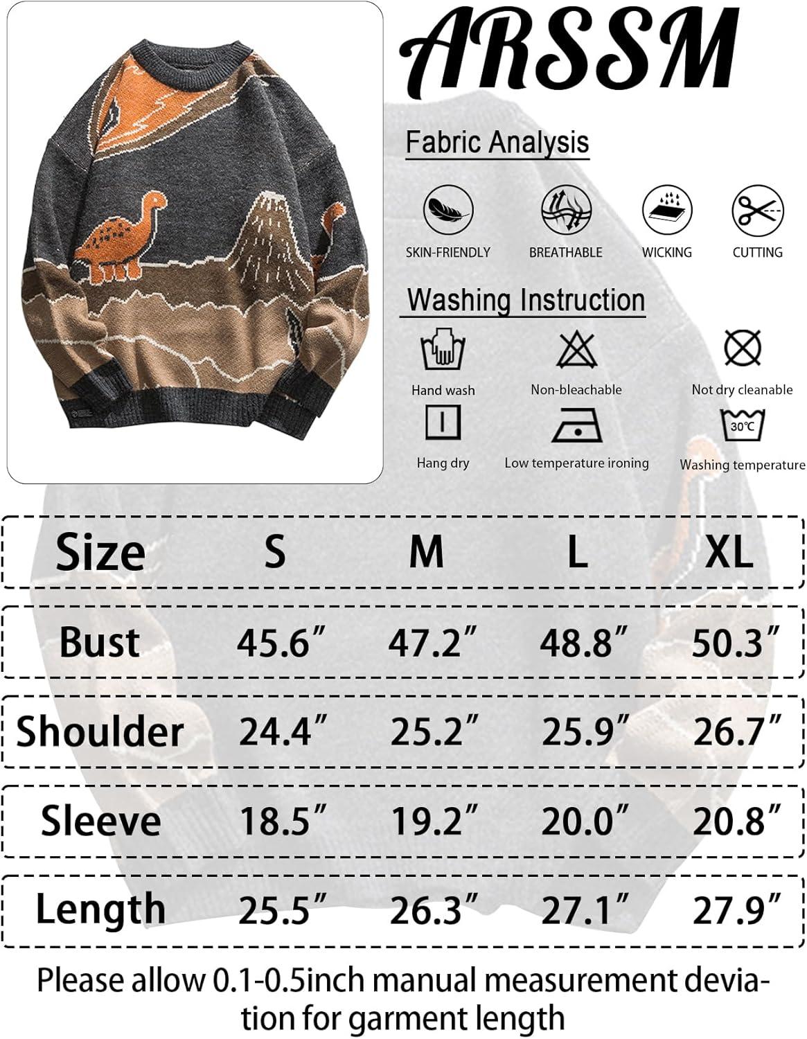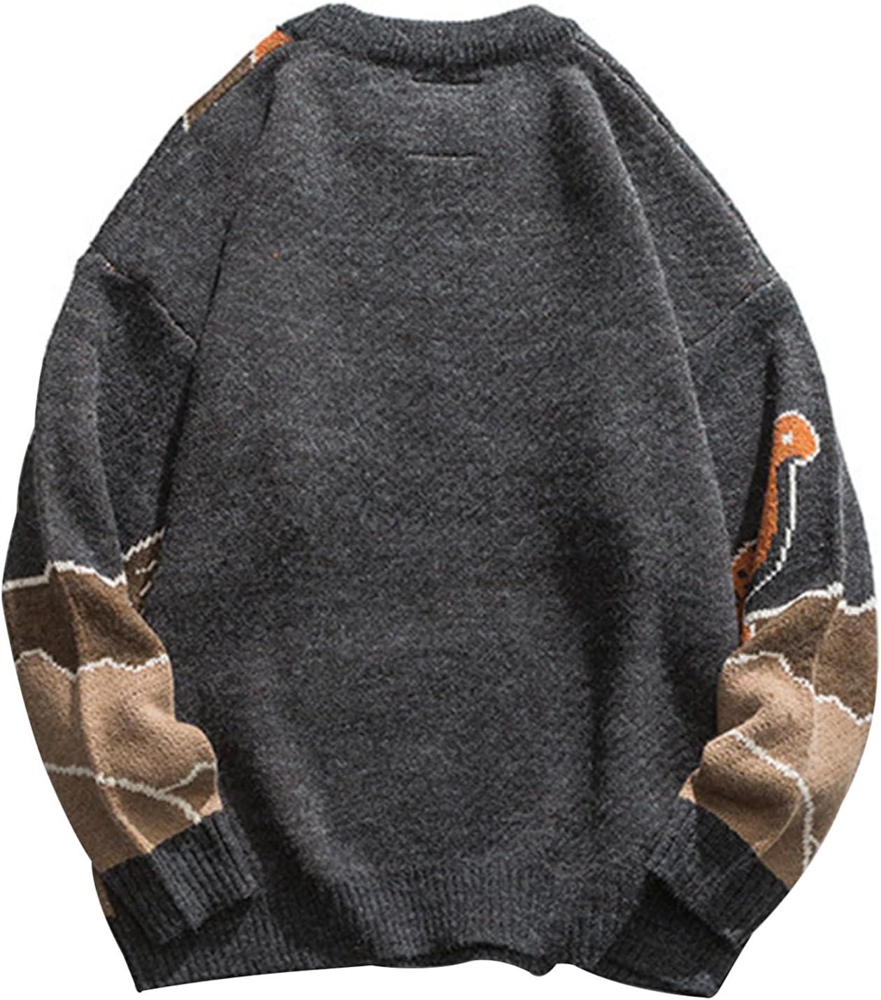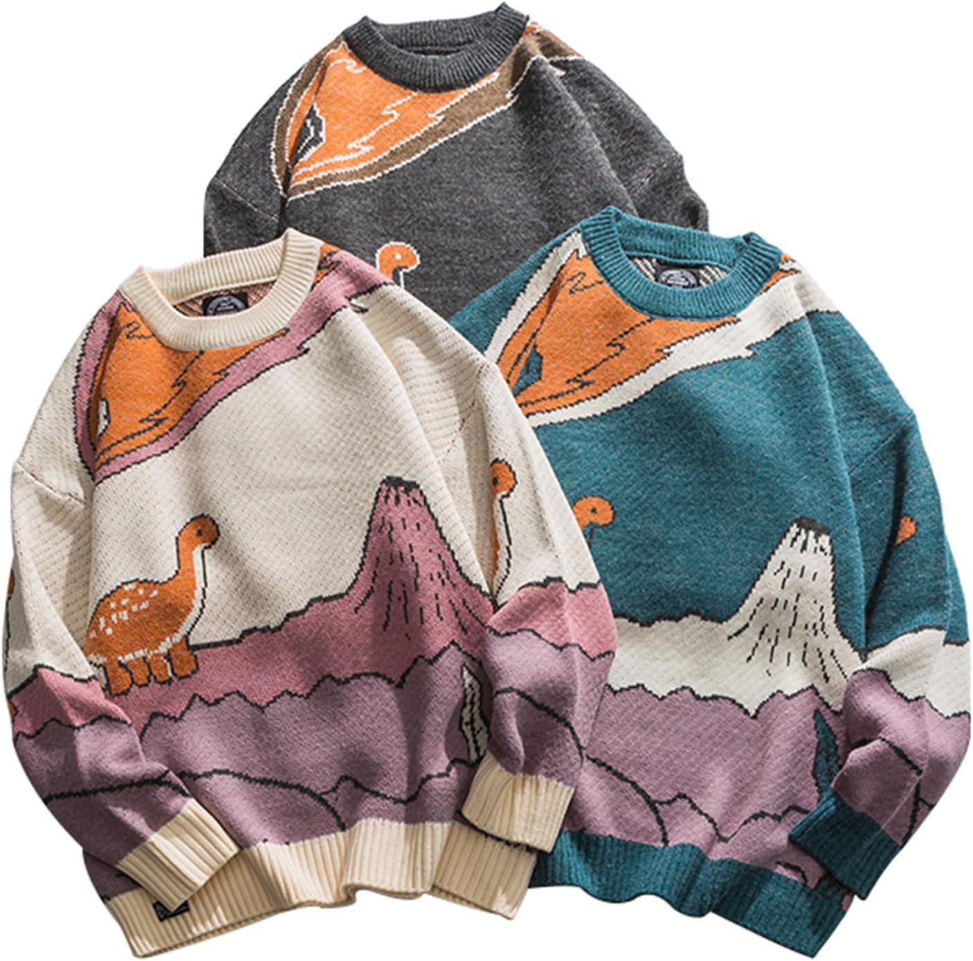 Arssm Mens Oversized Dinosaur Knit Pullover Sweater Fashion Cartoon Unisex Sweater Long Sleeve Crewneck Vintage Tops(Grey)