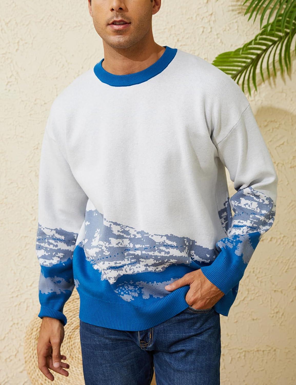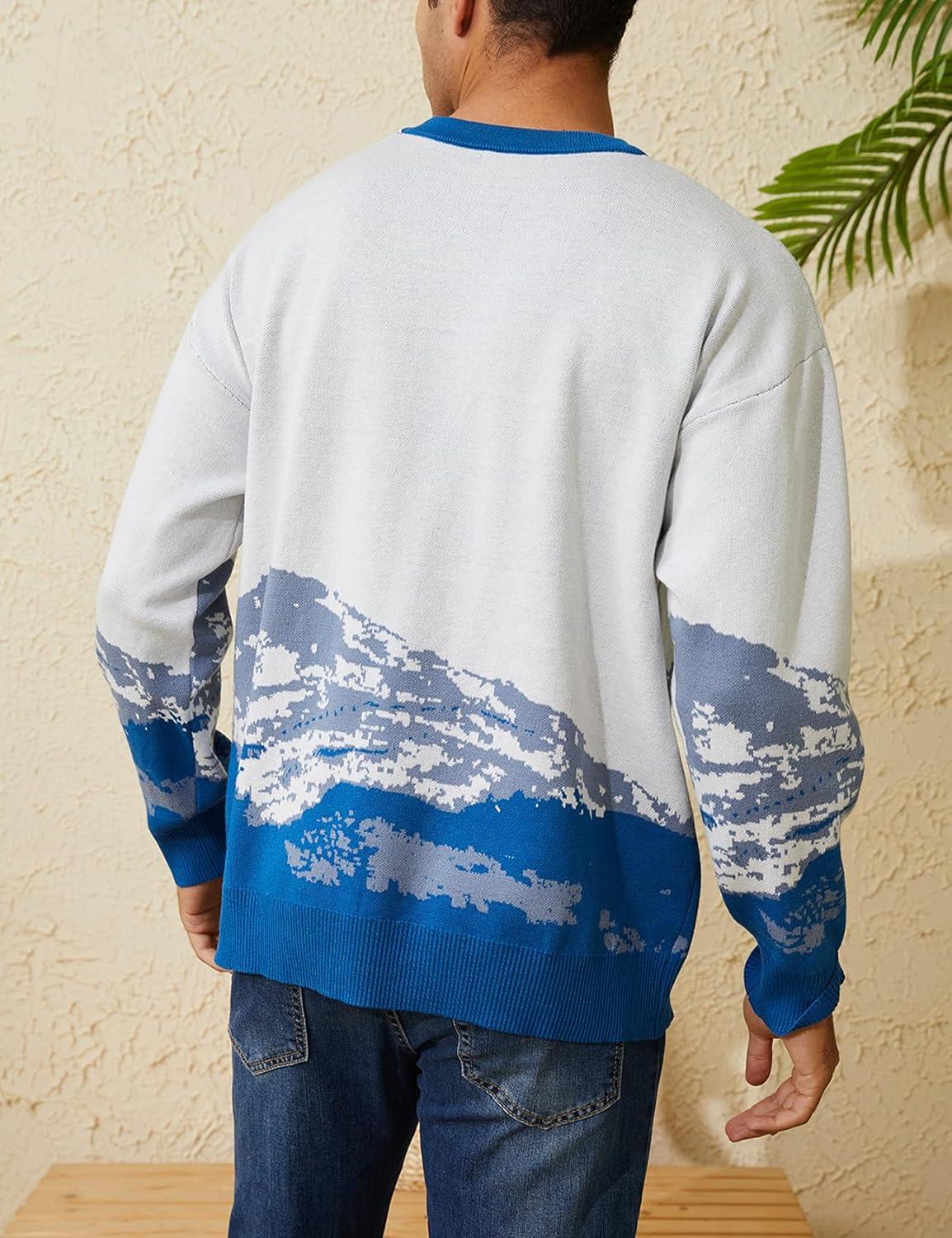 Arssm Mens Vintage Sweater Grandpa y2k Oversized Casual Cable Knit Sweater Pullover Graphic Crewneck Tops(Blue)