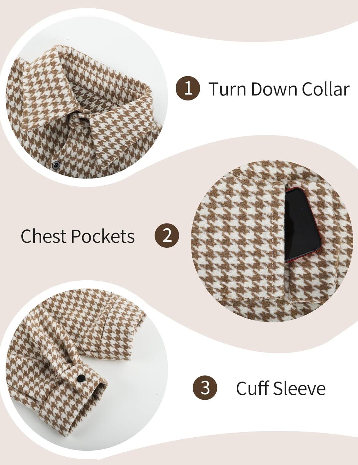 Arssm Plaid Shacket Jacket Women Long Sleeve Oversized Button Down Shirt Houndstooth Flannel Casual Tops (Khaki-L)