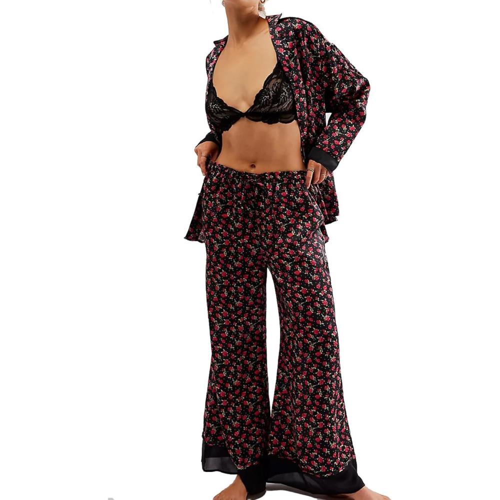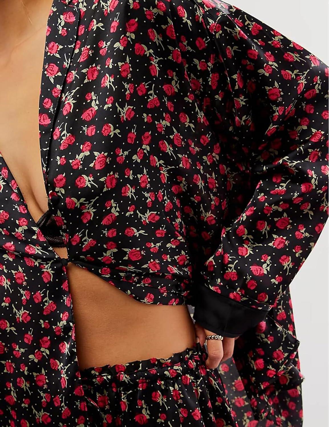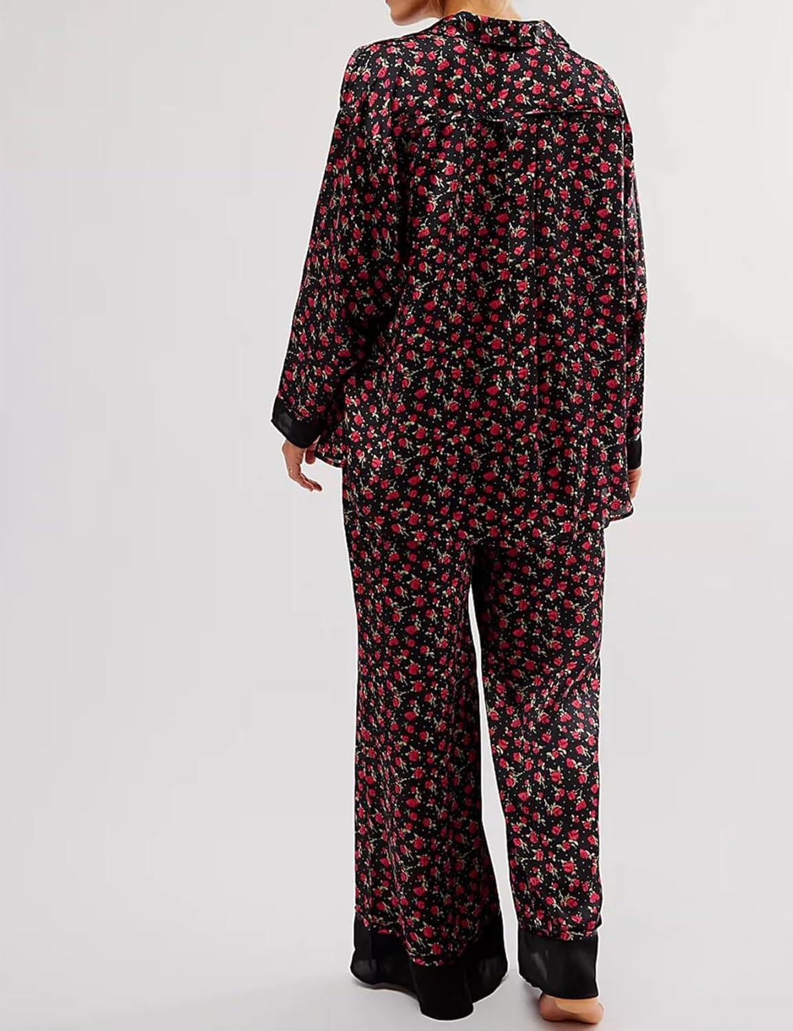 Arssm Women 2 Piece Satin Silk Pajama Set Floral Long Sleeve Pajamas Soft Button Down Pjs Set Sleepwear(Blackrose)