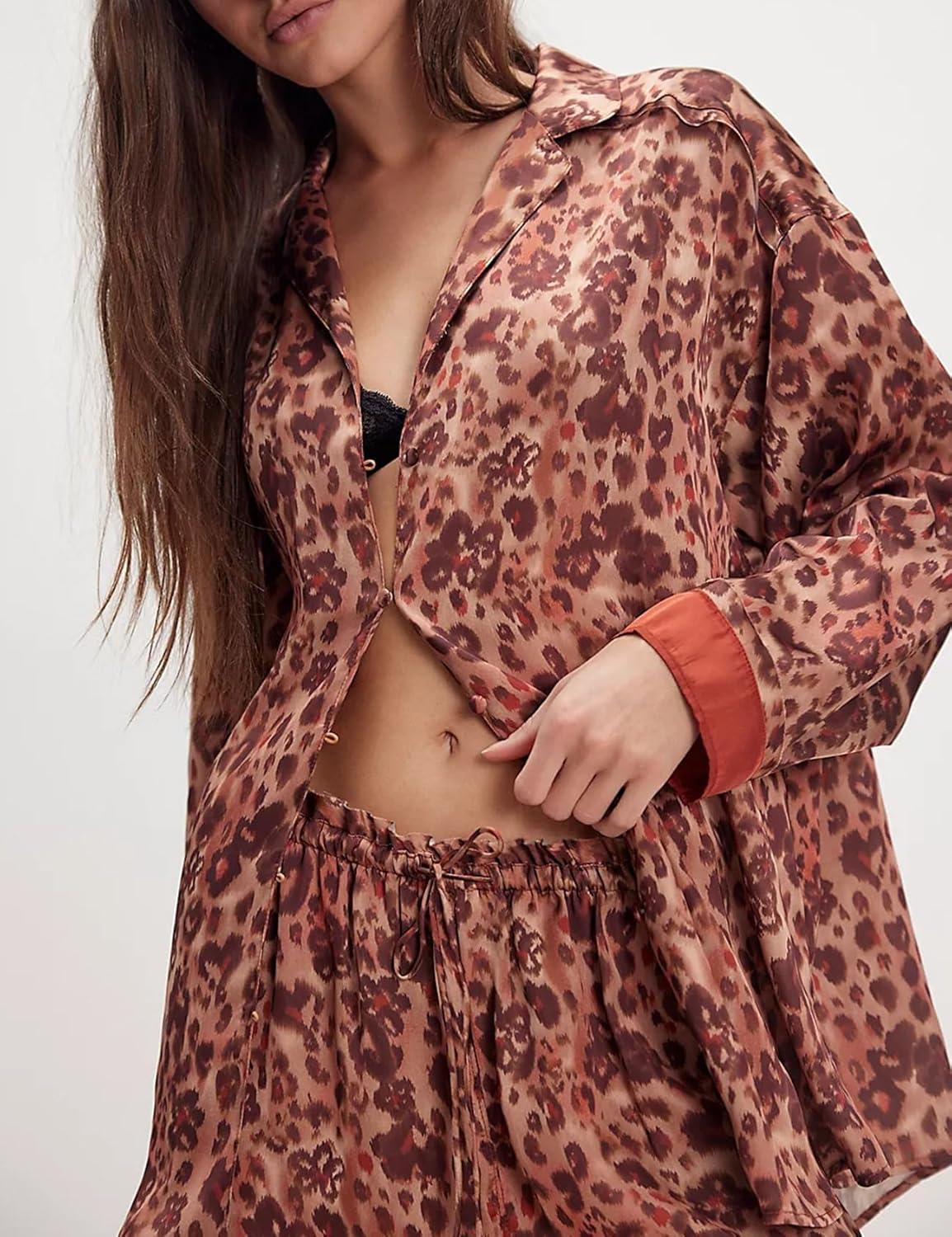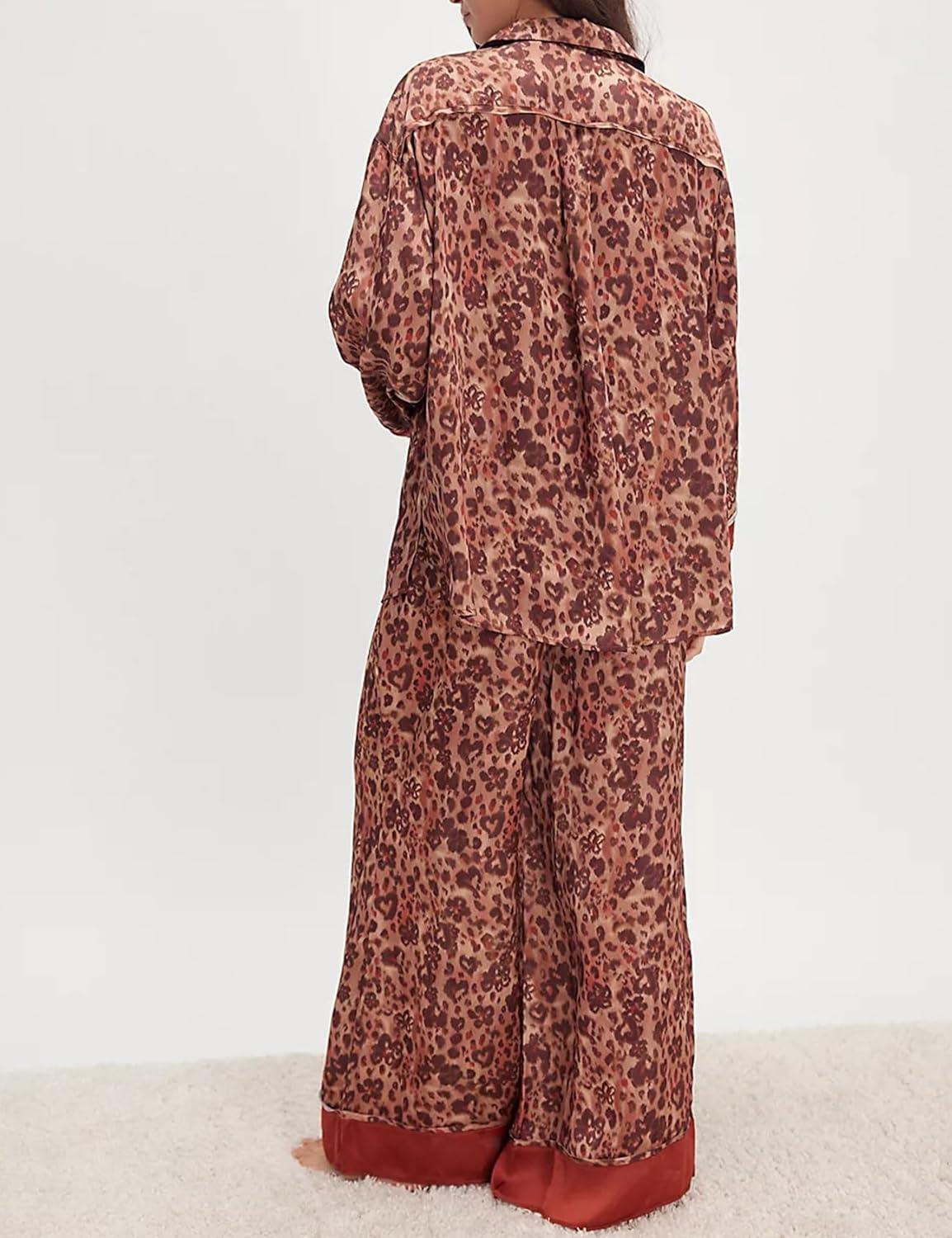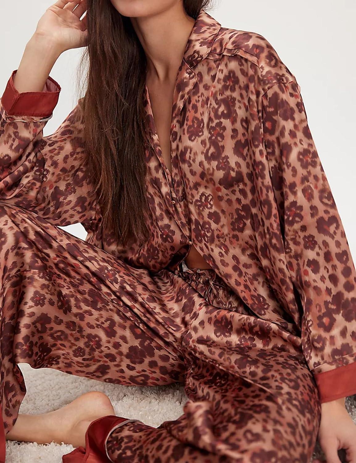 Arssm Women 2 Piece Satin Silk Pajama Set Floral Long Sleeve Pajamas Soft Button Down Pjs Set Sleepwear(Leopard)