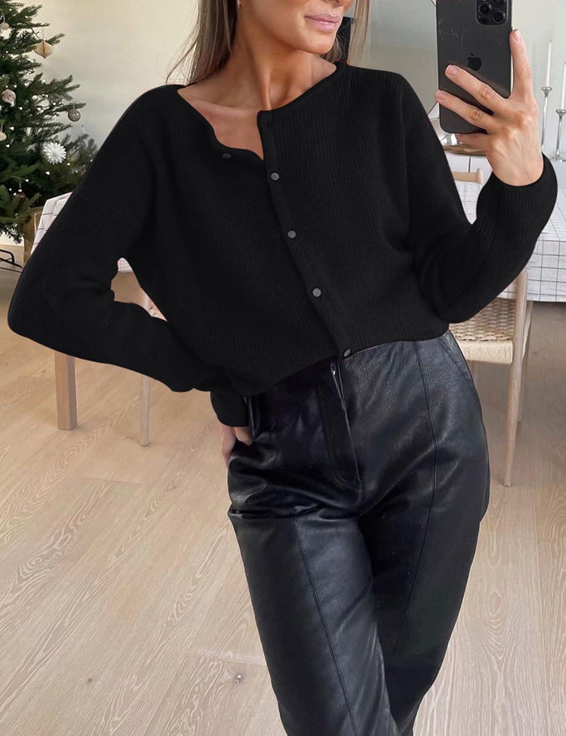Arssm Women Button Down Cardigan Sweater Crewneck Soft Knit Long Sleeve Y2k Fall Jumper Tops(Black)