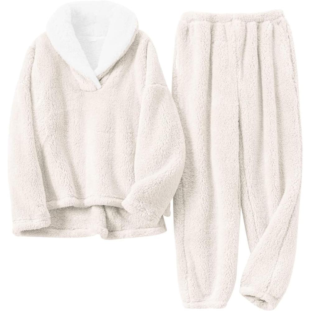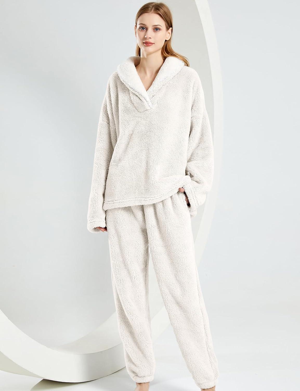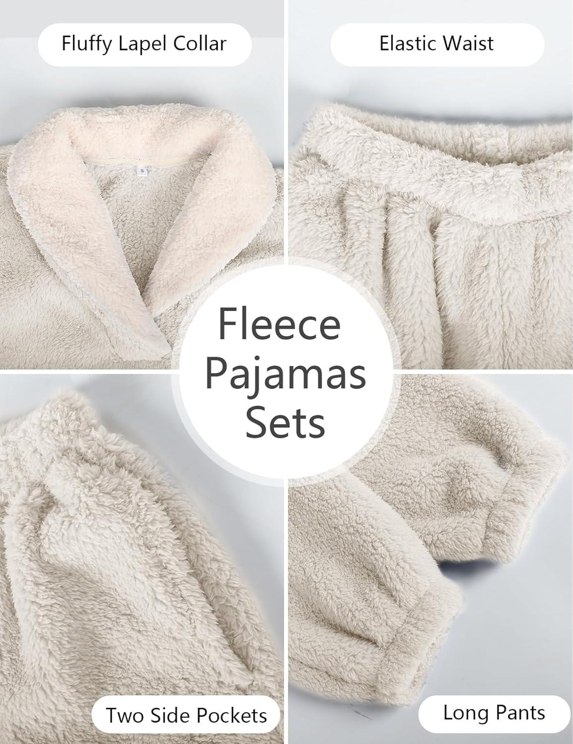 Arssm Women Fluffy Pajamas Set Fleece Pajamas Winter Warm Loose Plush Fuzzy Sets 2 Piece Cozy Sleepwear(Beige)