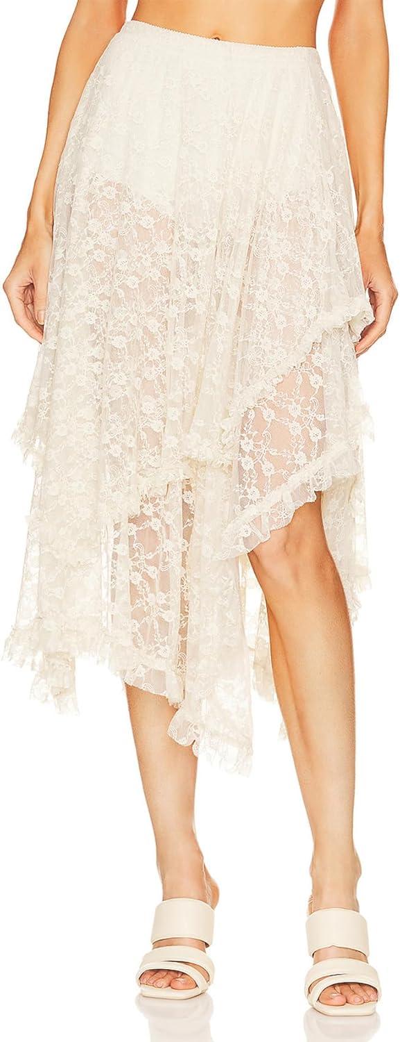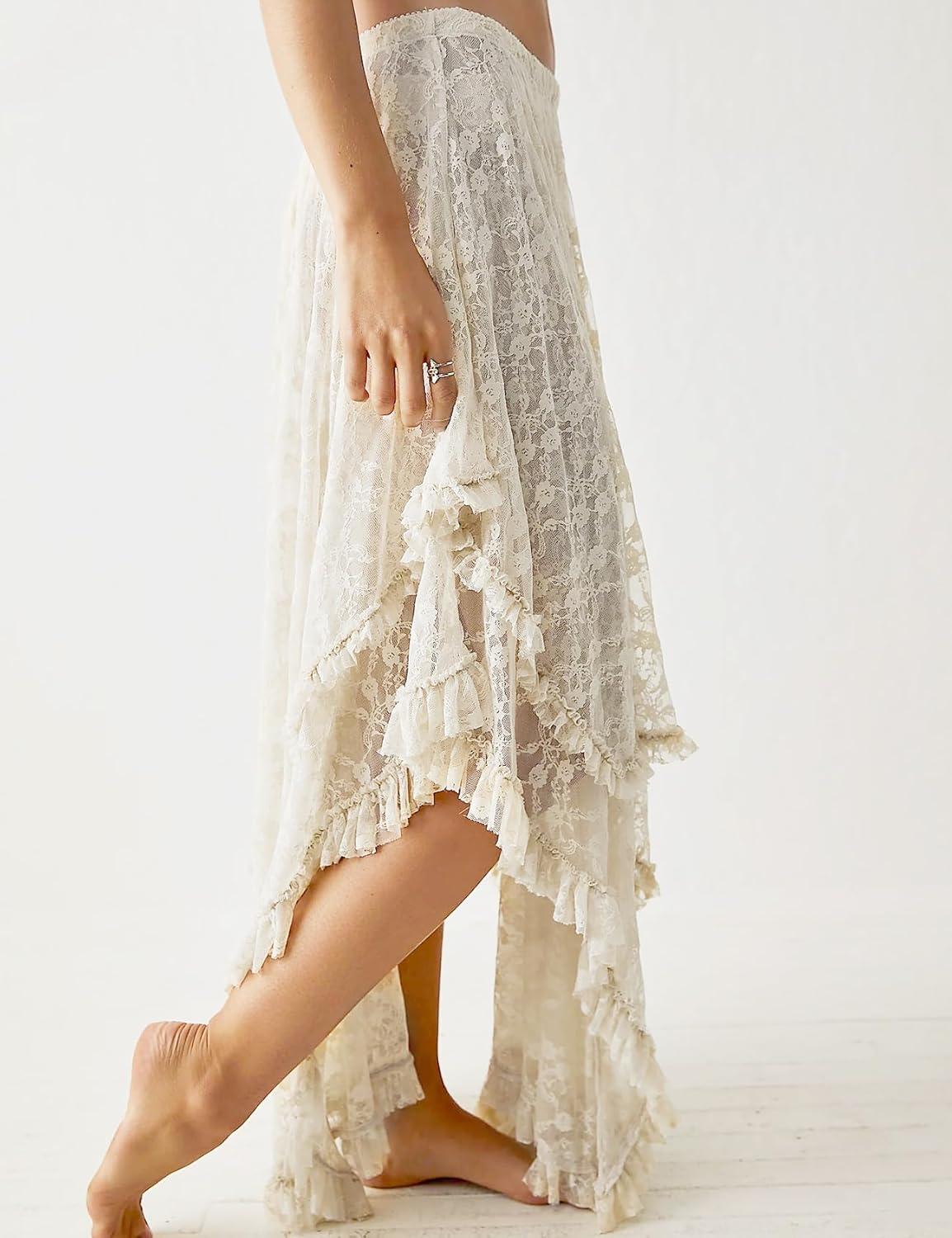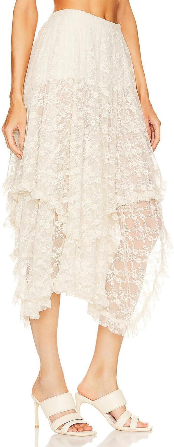 Arssm Women Long Lace Skirts Elastic Asymmetrical Layered Sexy See-Through Beach Floral Maxi Sheer Skirts(Beige)