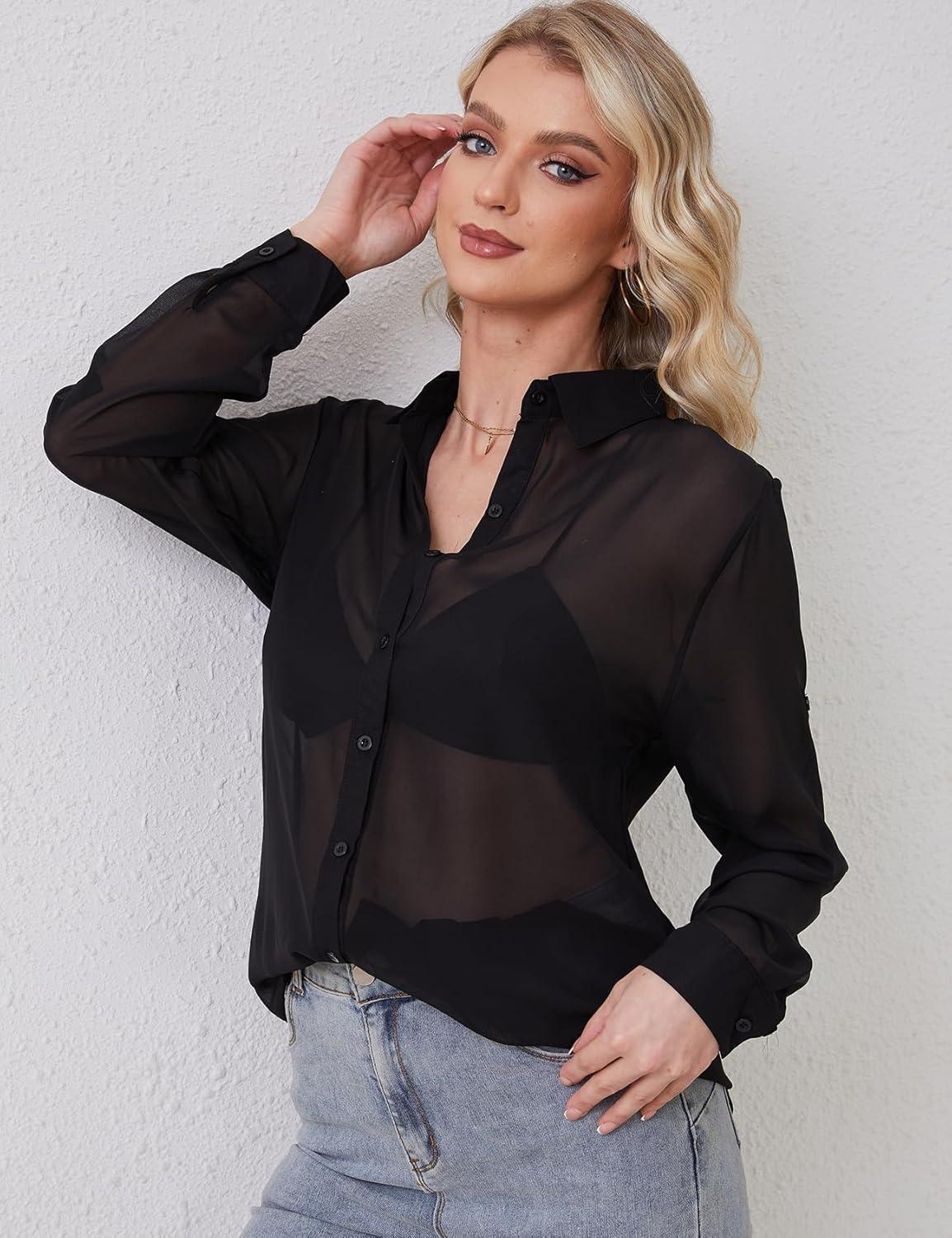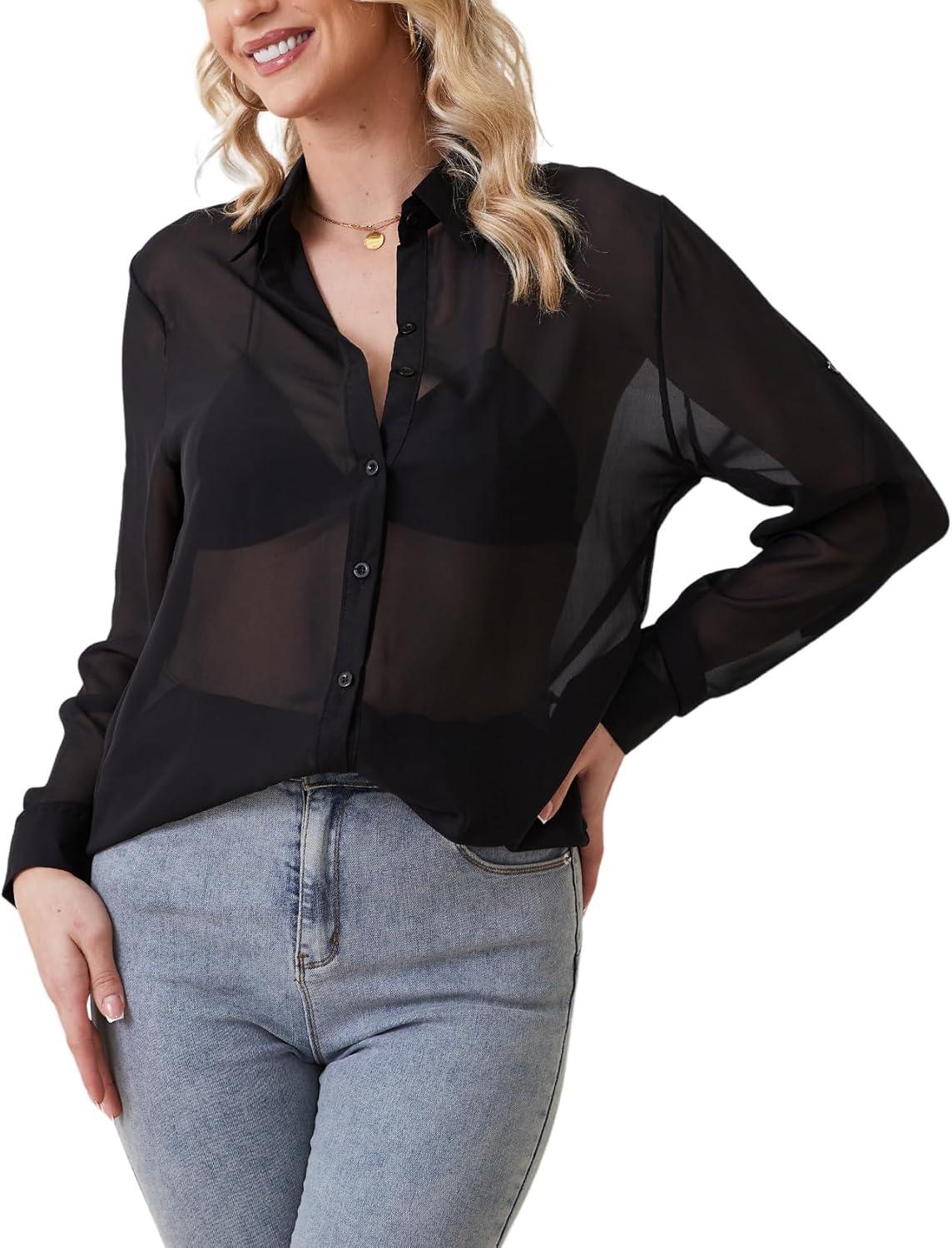 Arssm Women Sheer Button Up Blouse Mesh Long Sleeve Sexy See Through Tops Fashion Trendy Mesh Shirts Tops(Black)