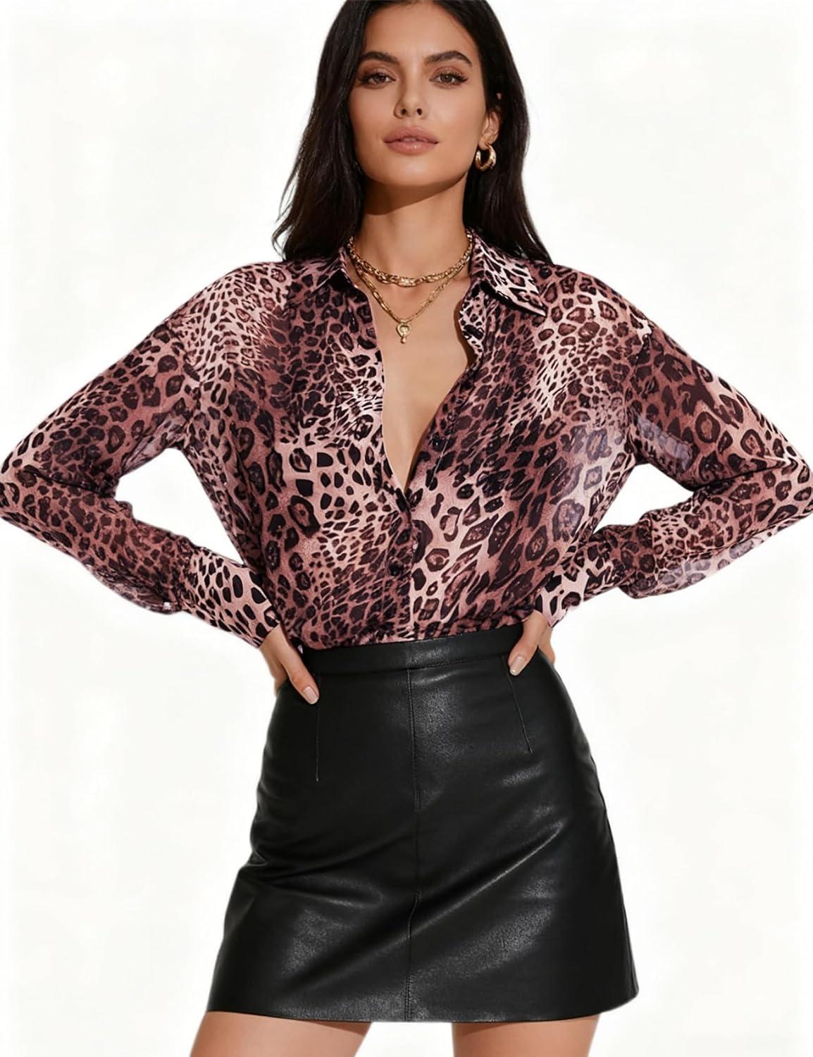 Arssm Women Sheer Button Up Blouse Mesh Long Sleeve Sexy See Through Tops Fashion Trendy Mesh Shirts Tops(Leopard)