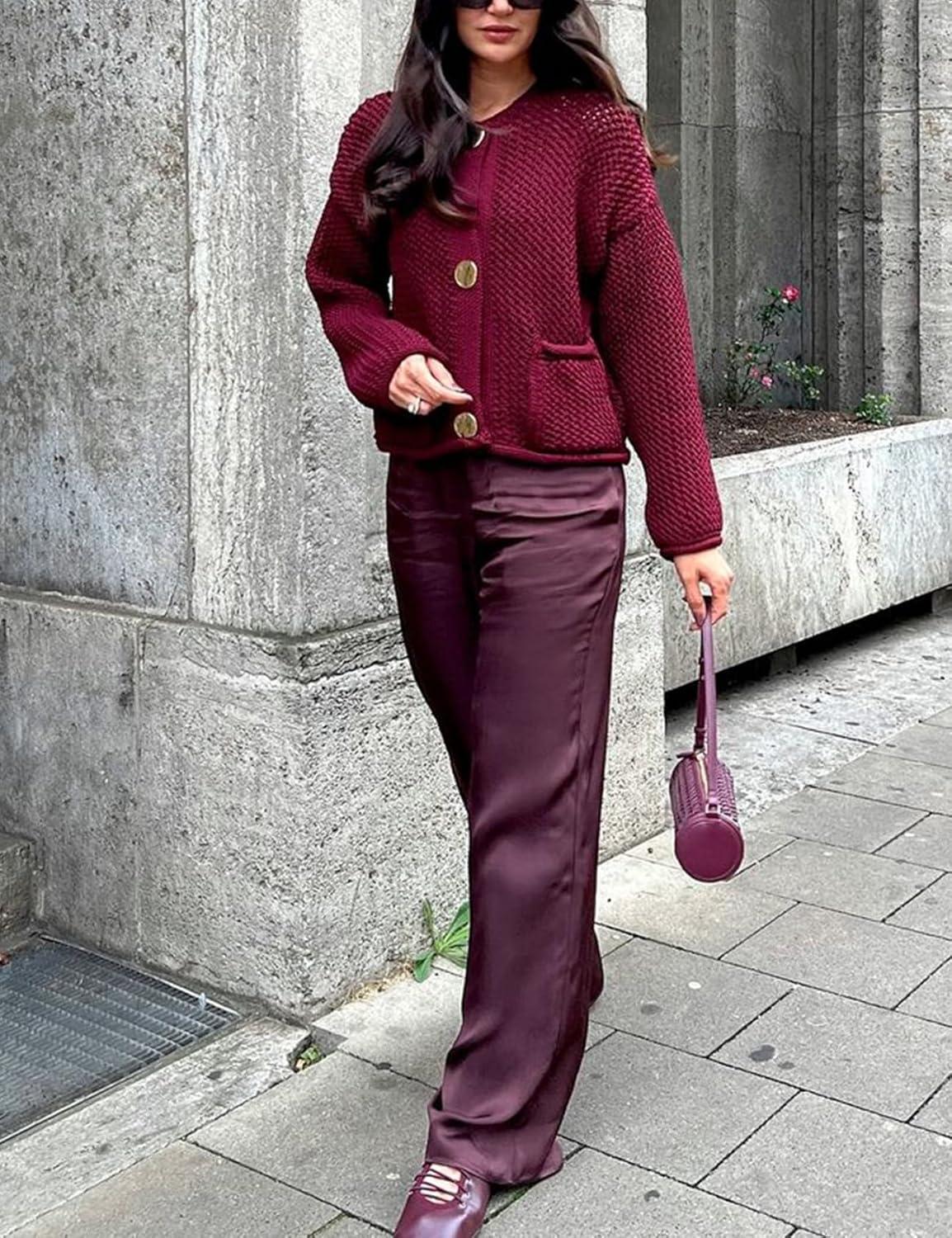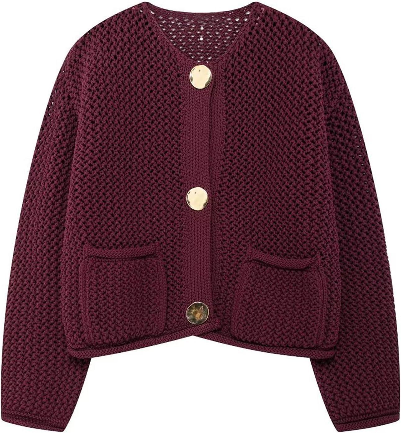 Arssm Womens Cardigan Sweaters 2024 V Neck Long Sleeve Sweater Button Down Knit Sweater Top with Pockets(Darkred)