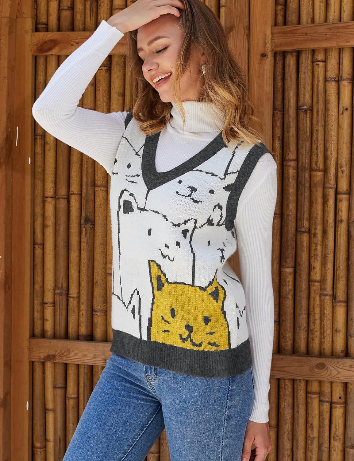 Arssm Womens Cat Print Pullover Sweater Vest V Neck Sleeveless Knit Vests 2025 Pullover Knitted Tank Top(Darkgrey)