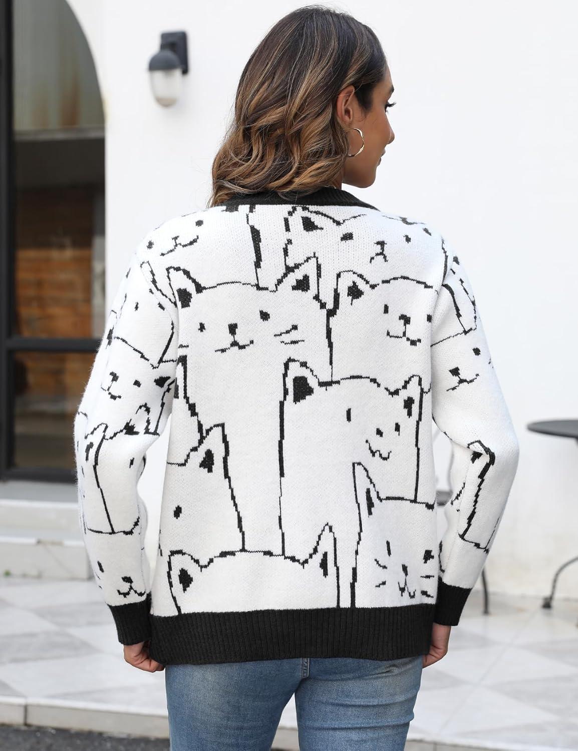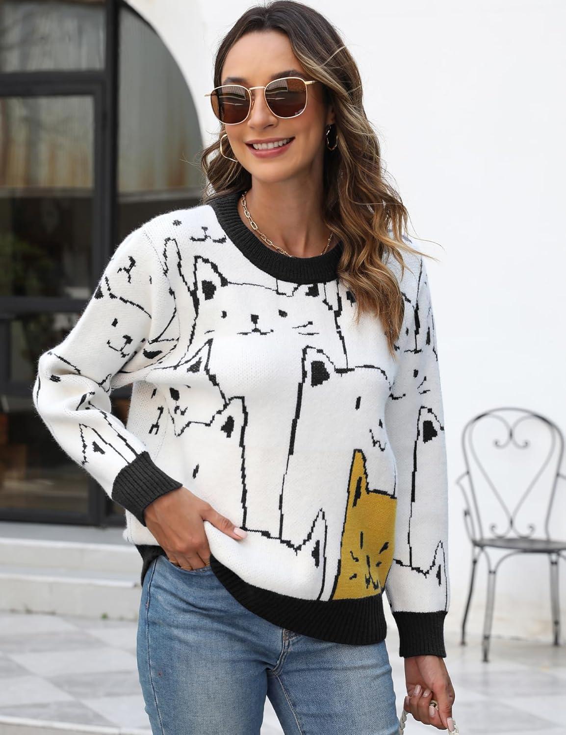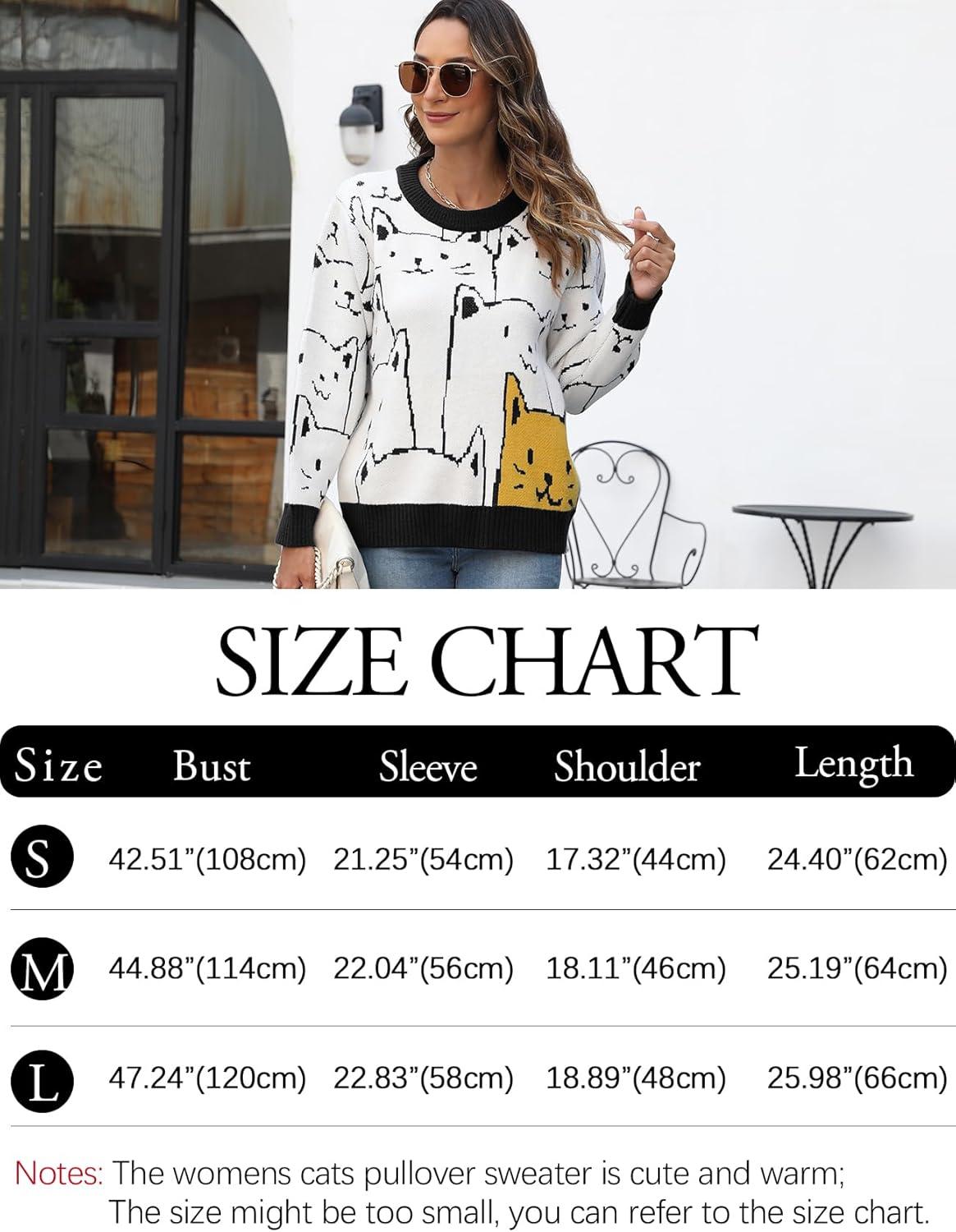 Arssm Womens Cat Sweaters 2024 Long Sleeve Oversized Cute Kawaii Cartoon Crewneck Pullover Knit Sweater Top(Black)