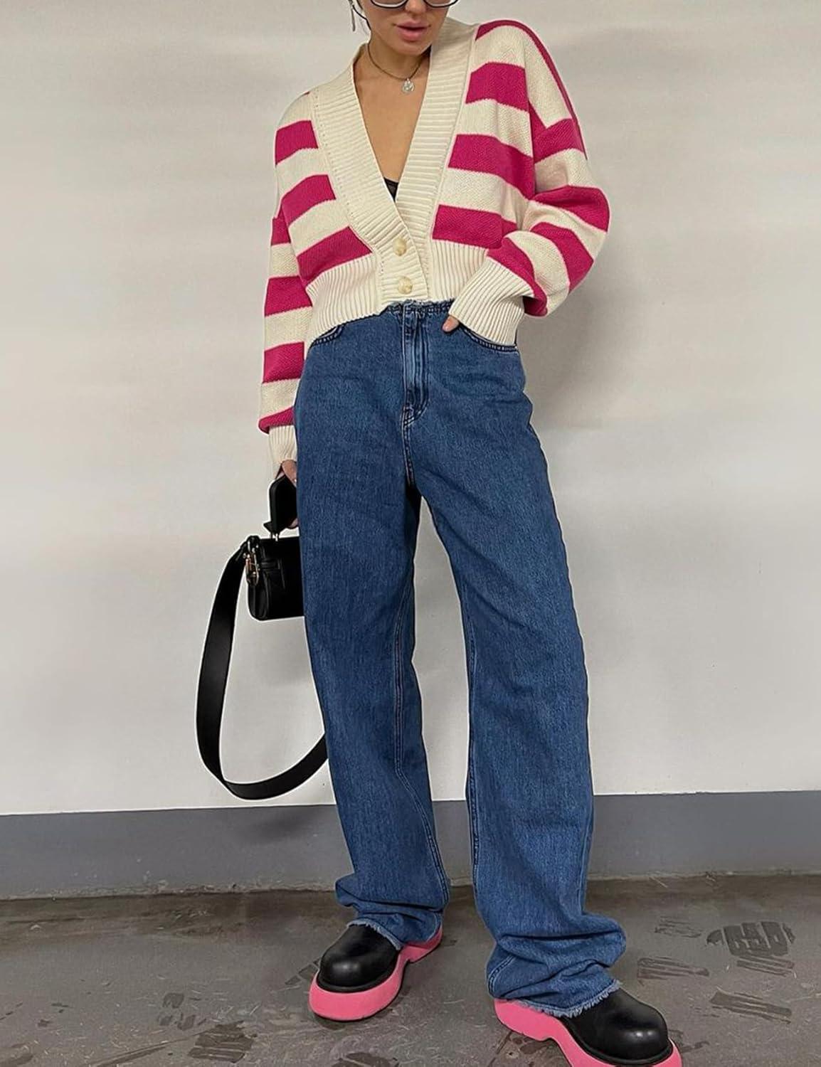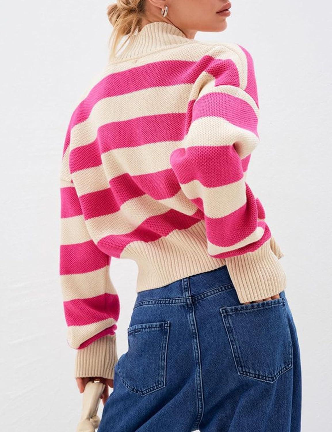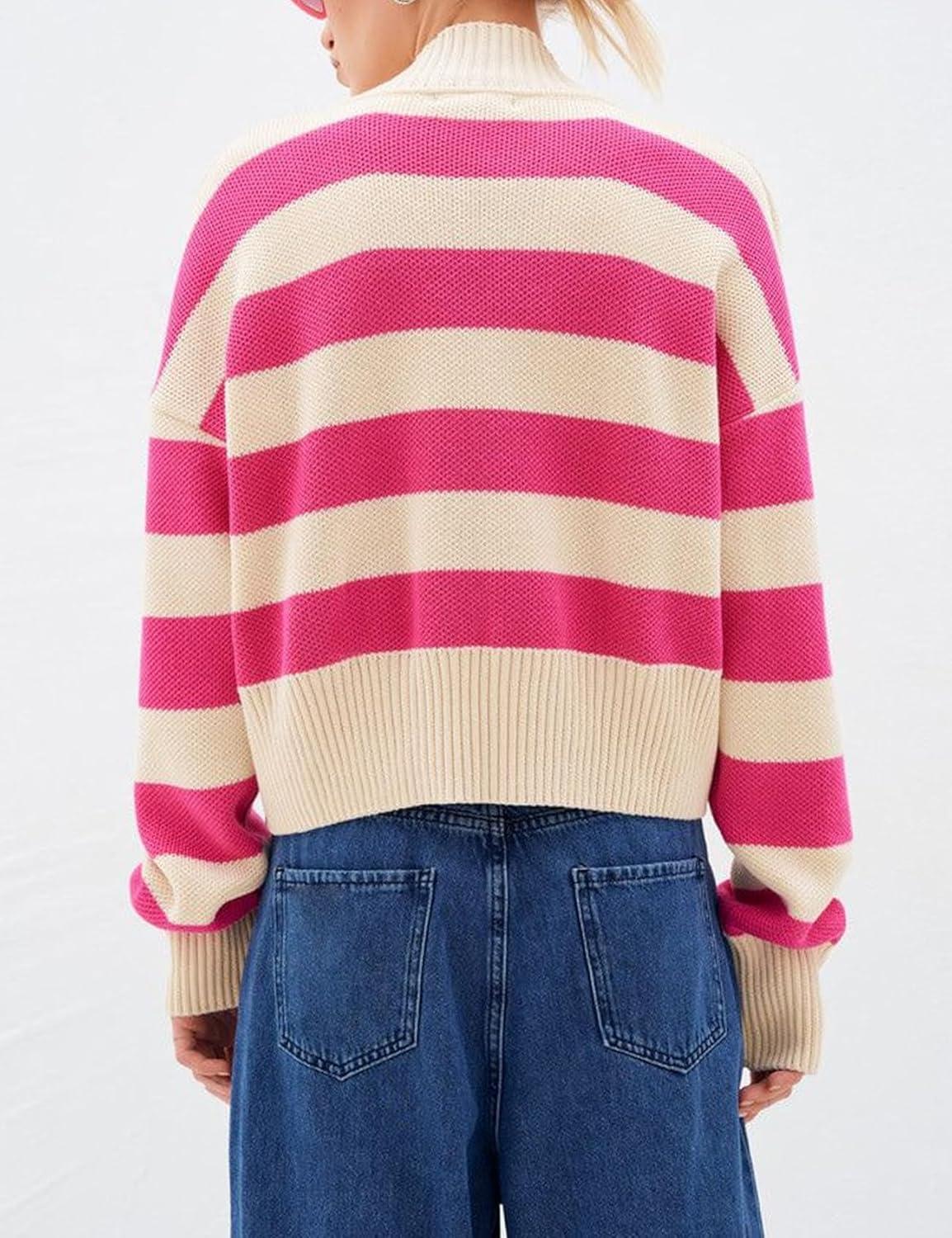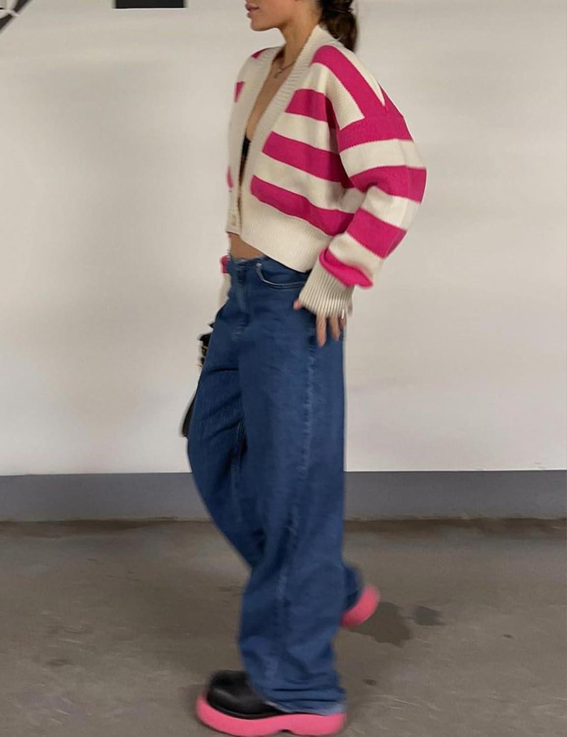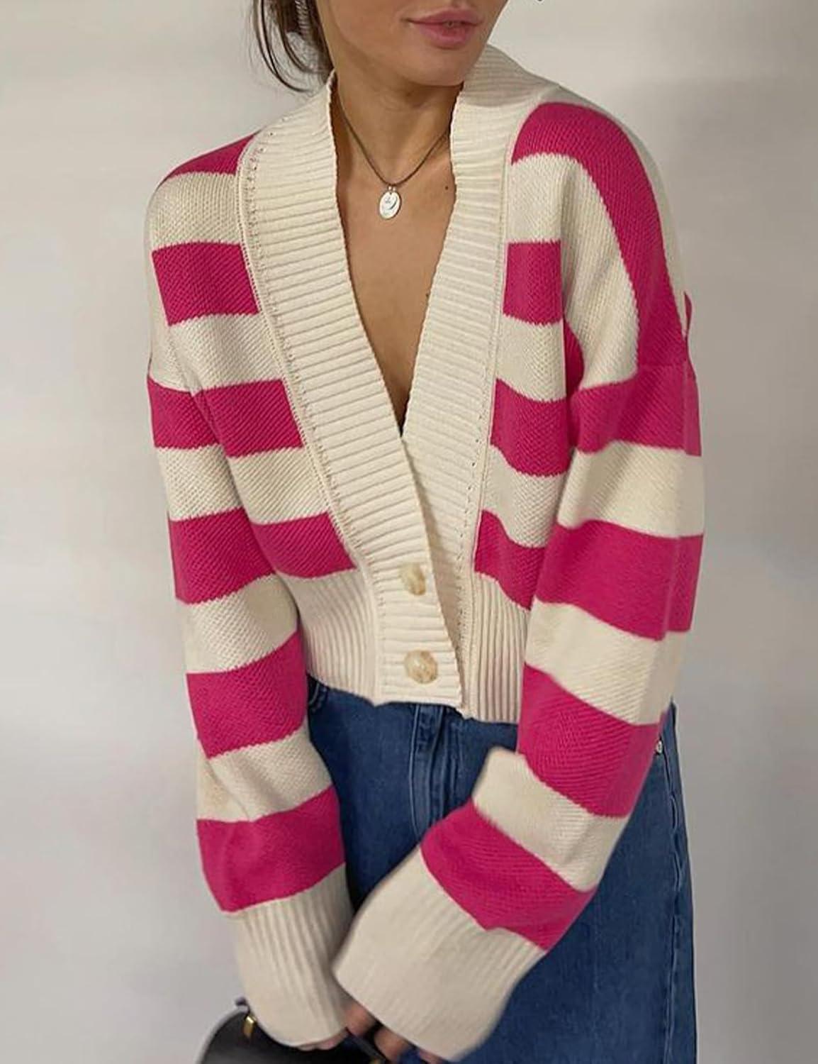 Arssm Womens Color Block Striped Sweater Long Sleeve Cardigans Button Down V Neck Knit Top Fashion 2024 Knitwear(Pink)