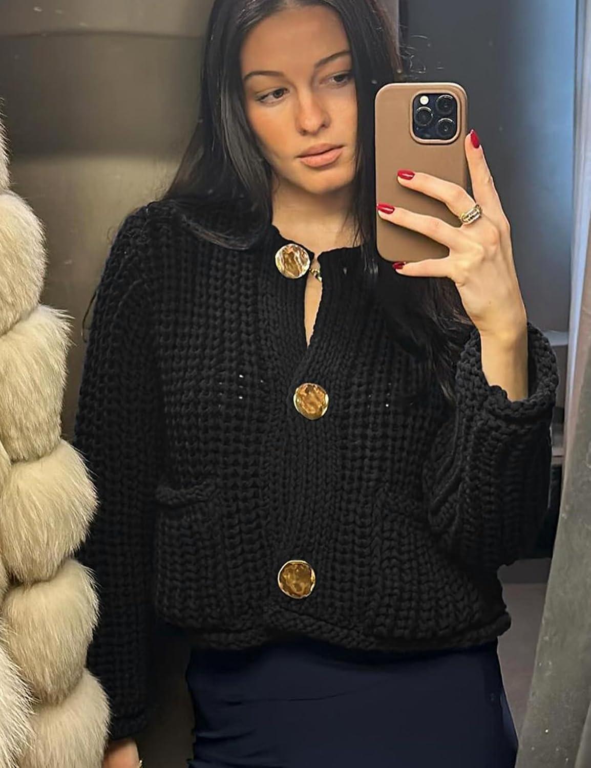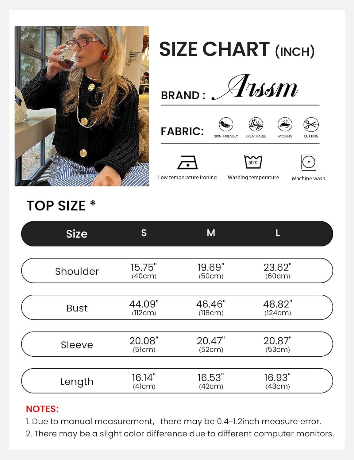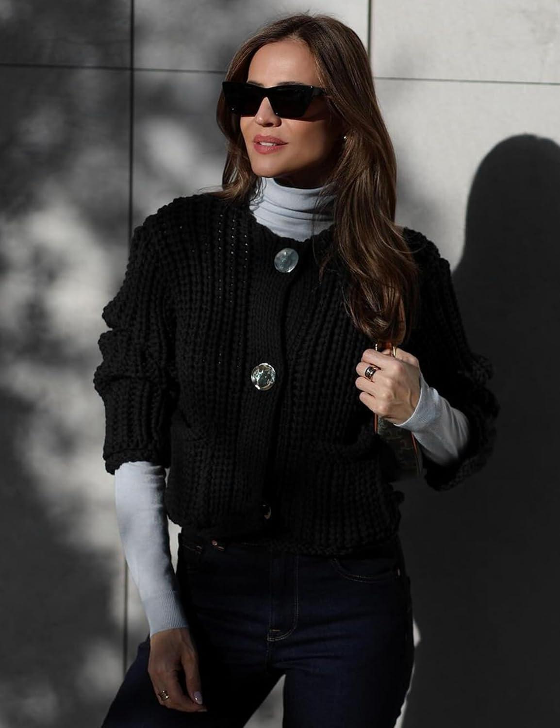 Arssm Womens Cropped Cardigan Sweaters Chunky Open Front Button Down Knit Sweater Long Sleeve Loose Cardigan Outerwear(Black)