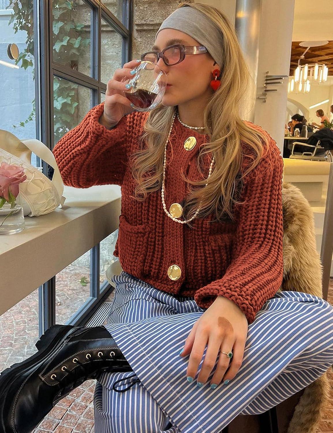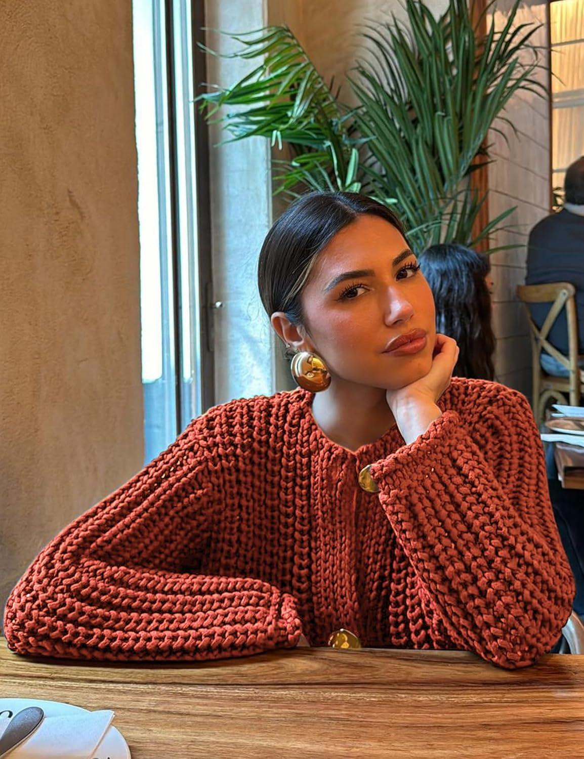 Arssm Womens Cropped Cardigan Sweaters Chunky Open Front Button Down Knit Sweater Long Sleeve Loose Cardigan Outerwear(Brickred)