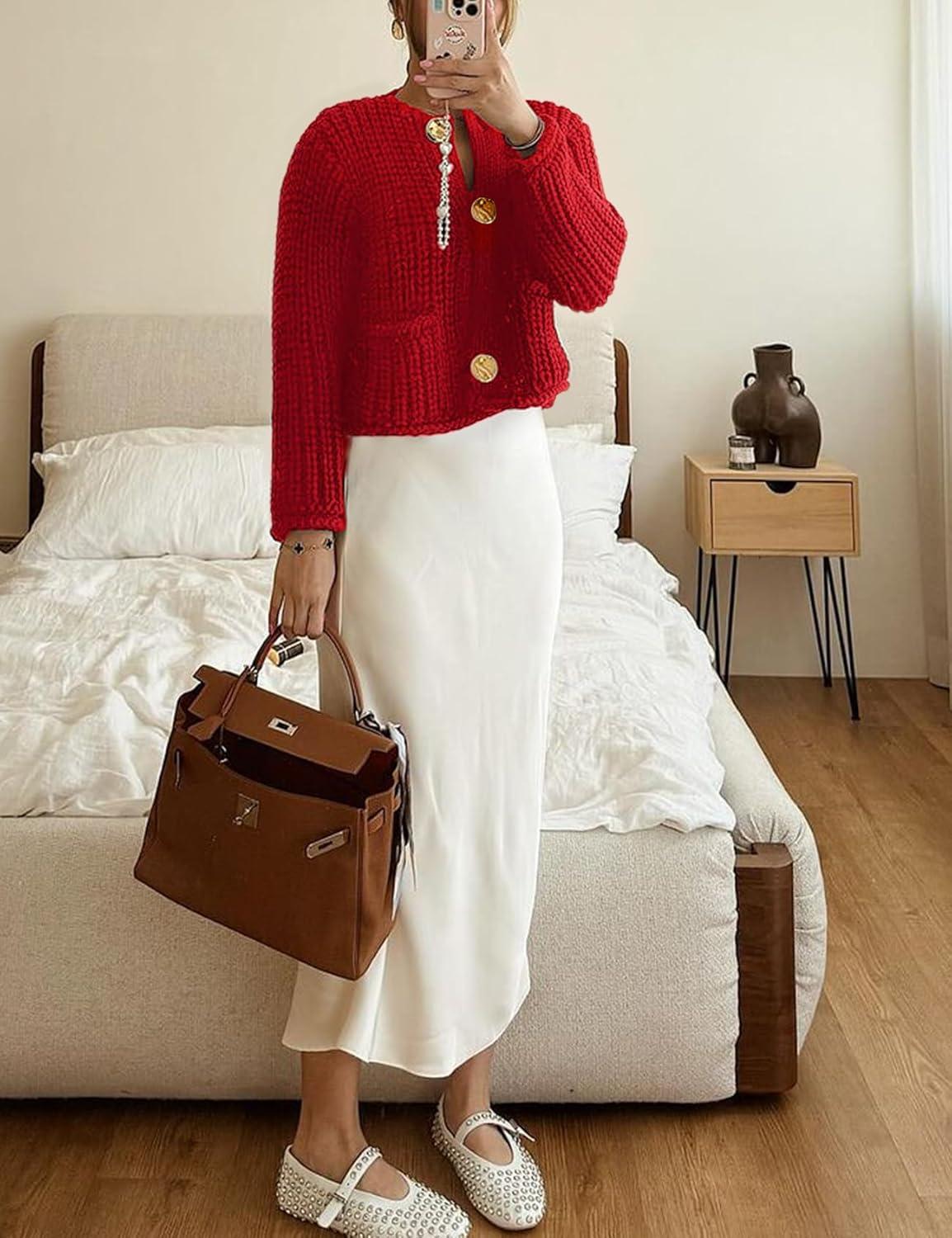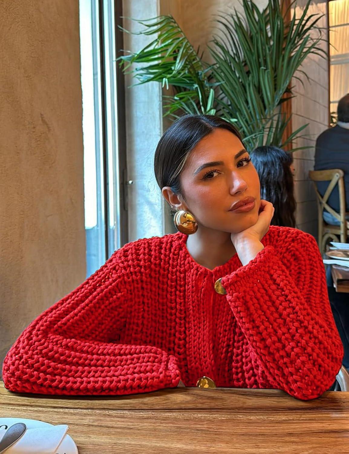 Arssm Womens Cropped Cardigan Sweaters Chunky Open Front Button Down Knit Sweater Long Sleeve Loose Cardigan Outerwear(Red)