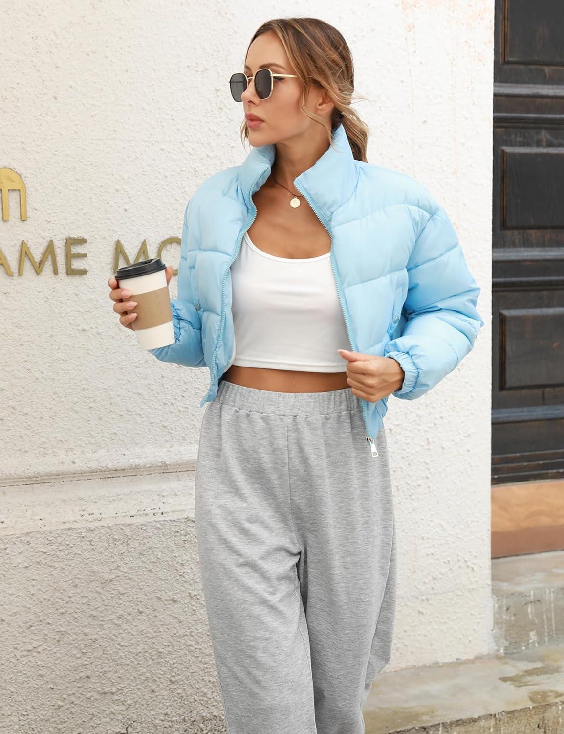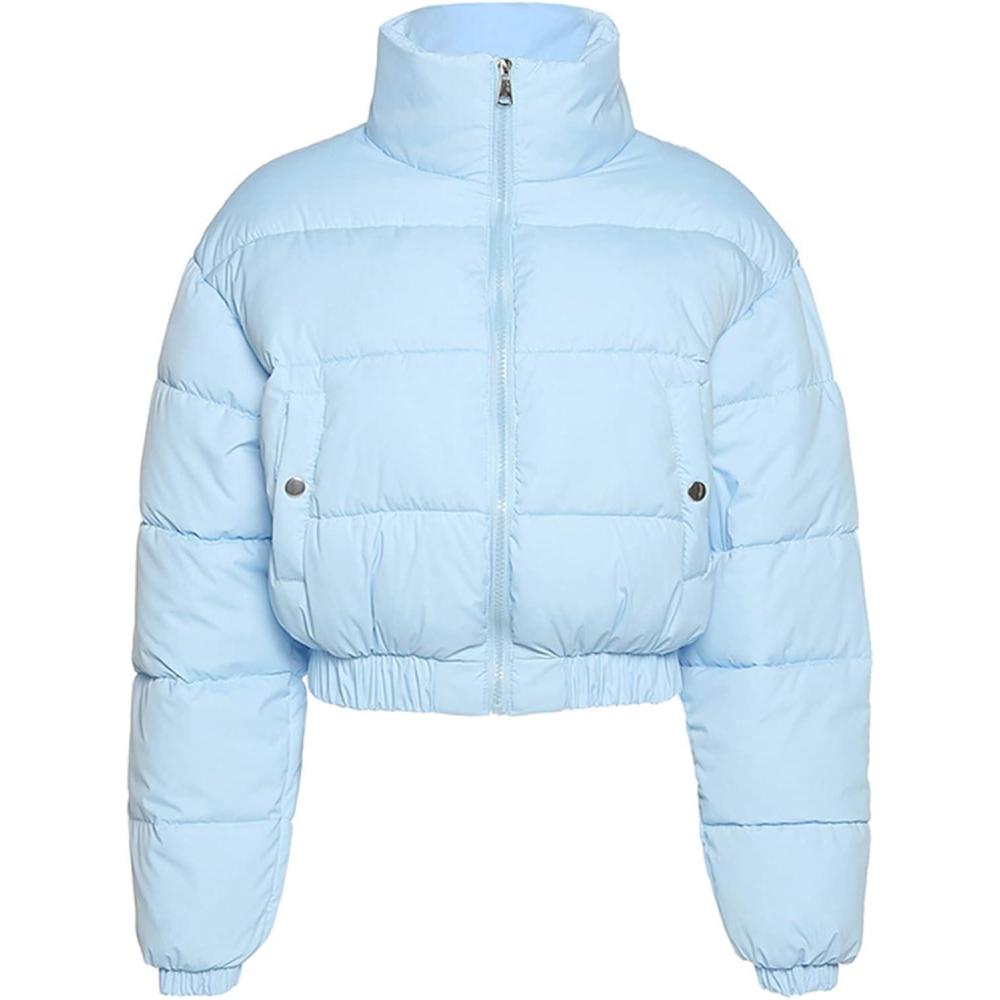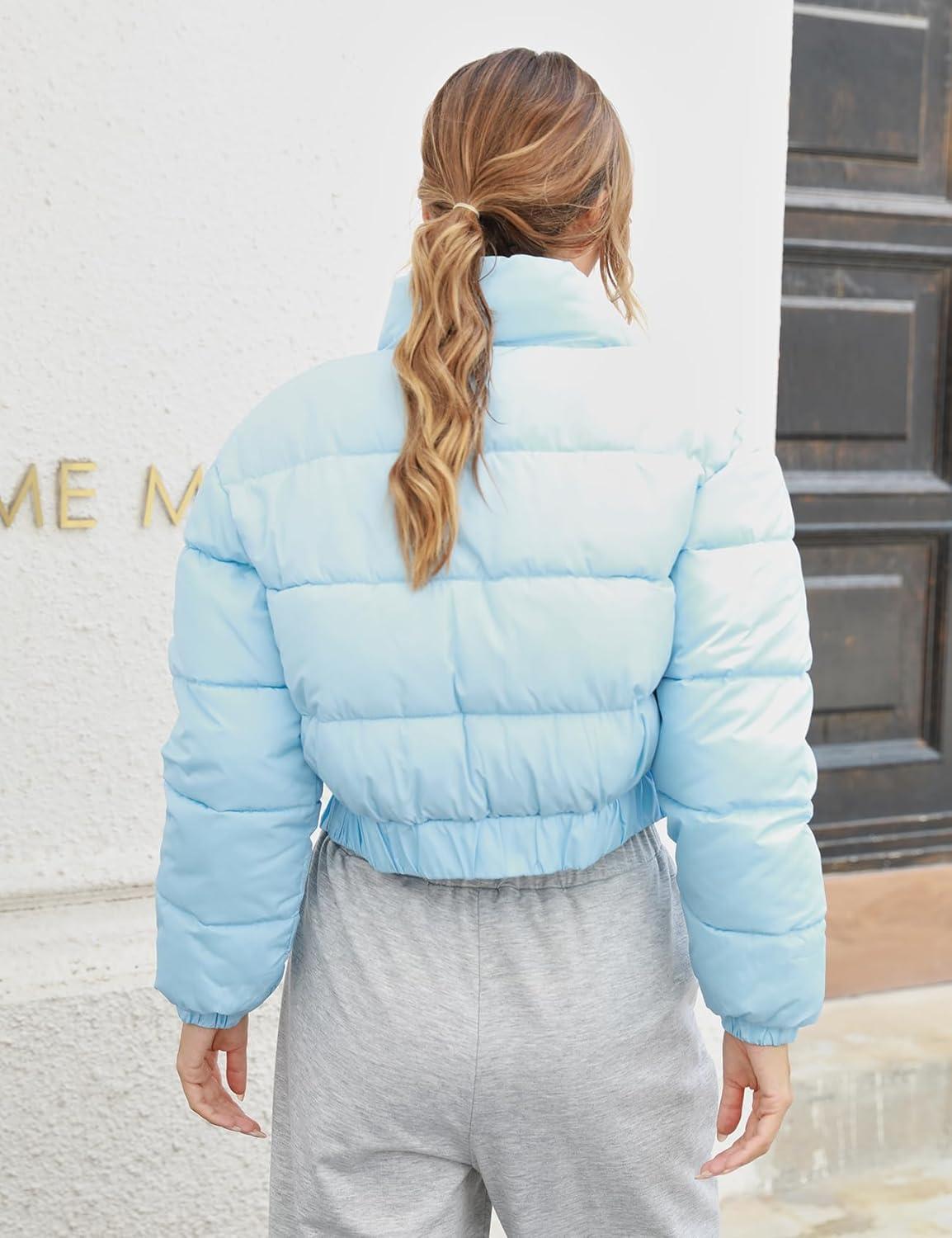 Arssm Womens Cropped Puffer Jacket Warm Winter Padded Quilted Long Sleeve Zip Up Casual Short Bubble Coat with Pockets (Blue-L)