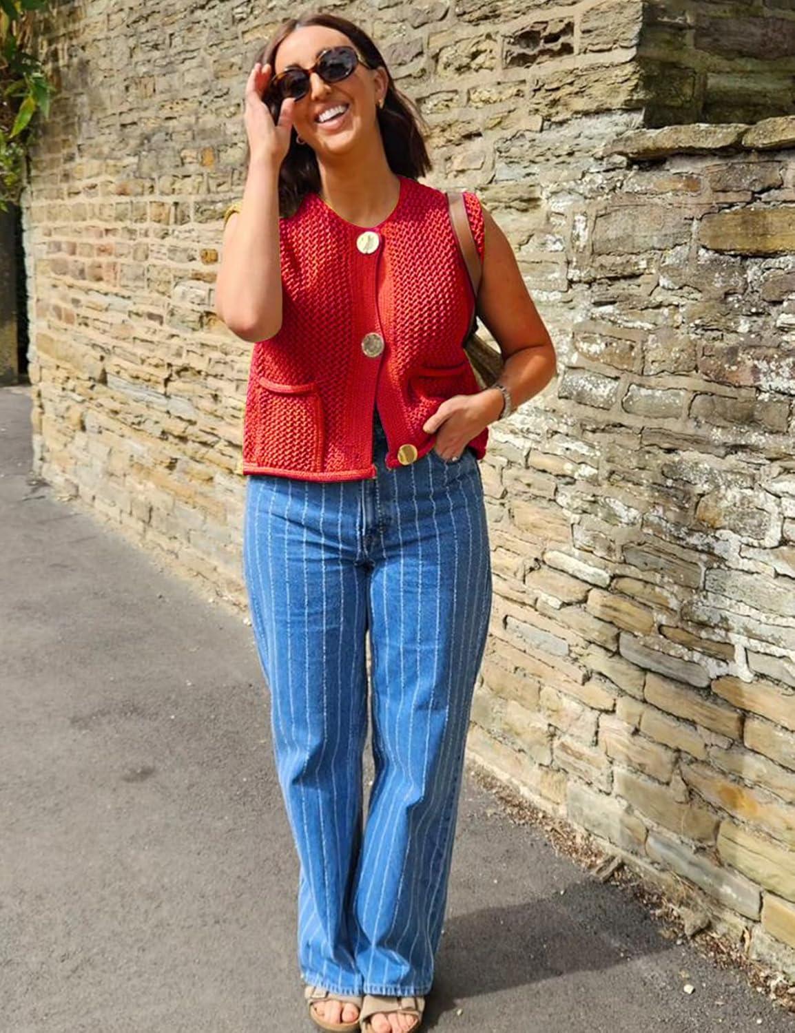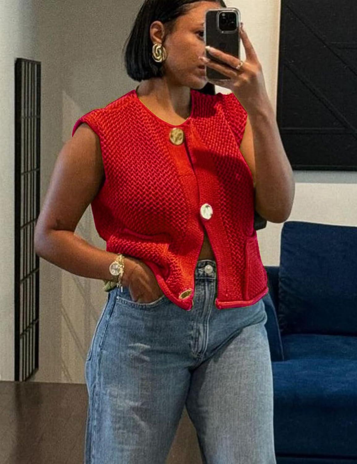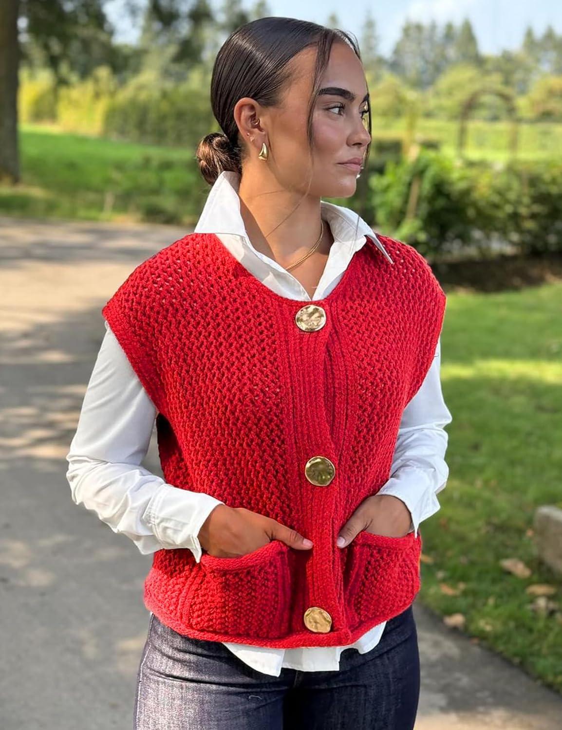Arssm Womens Cropped Sweater Vest Crochet Chunky Knit Vest Casual Sleeveless Button Down Knitted Sweater Vest