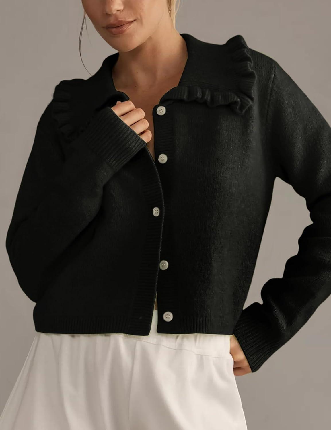 Arssm Womens Ruffle Collar Cardigan Cropped Button Down Open Front Sweaters Knitted Long Sleeve Fall 2025 Elegant Outwear(Black)