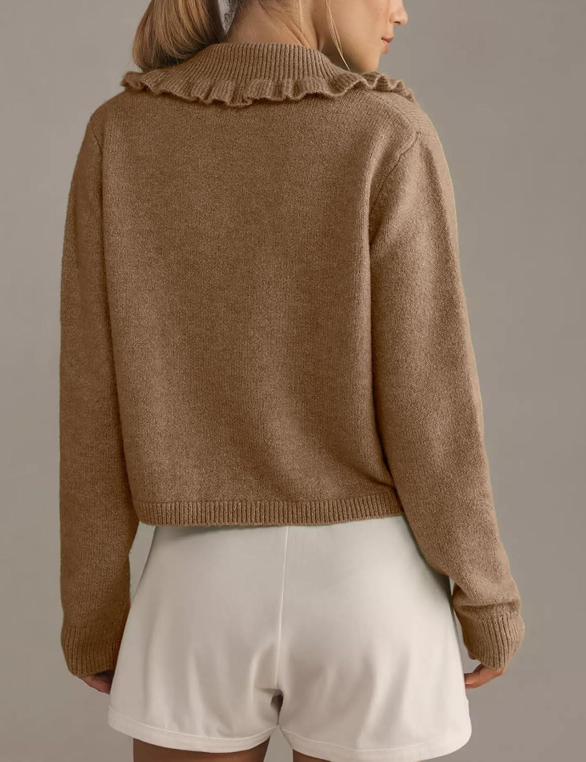 Arssm Womens Ruffle Collar Cardigan Cropped Button Down Open Front Sweaters Knitted Long Sleeve Fall 2025 Elegant Outwear(Brown)