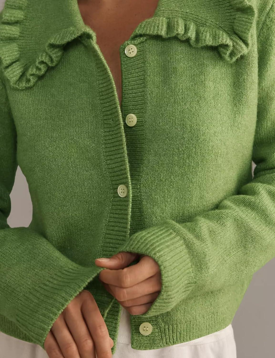 Arssm Womens Ruffle Collar Cardigan Cropped Button Down Open Front Sweaters Knitted Long Sleeve Fall 2025 Elegant Outwear(Green)