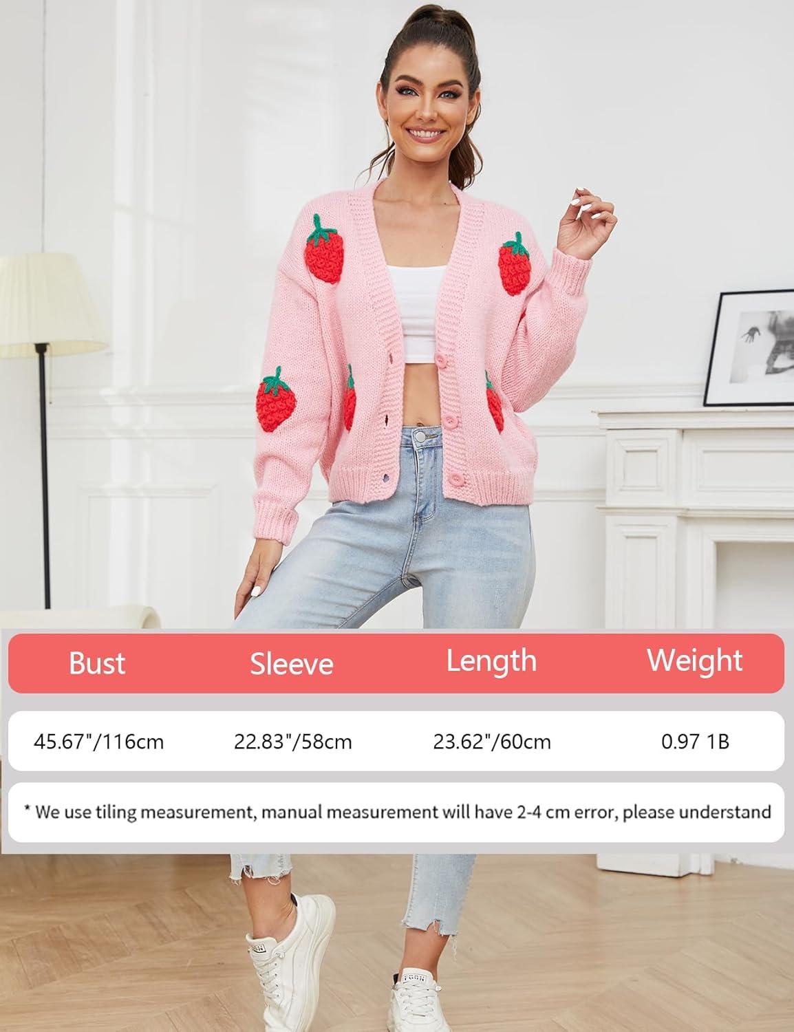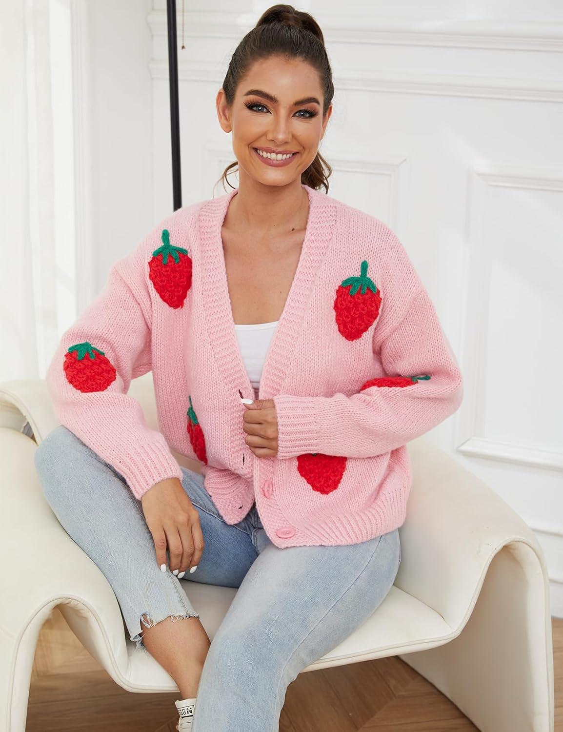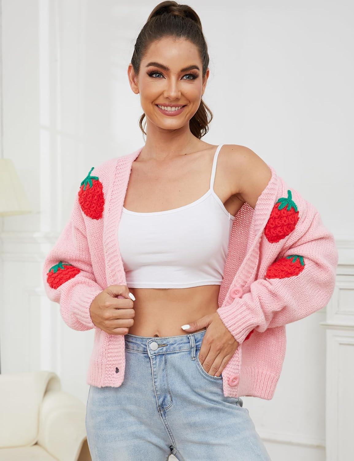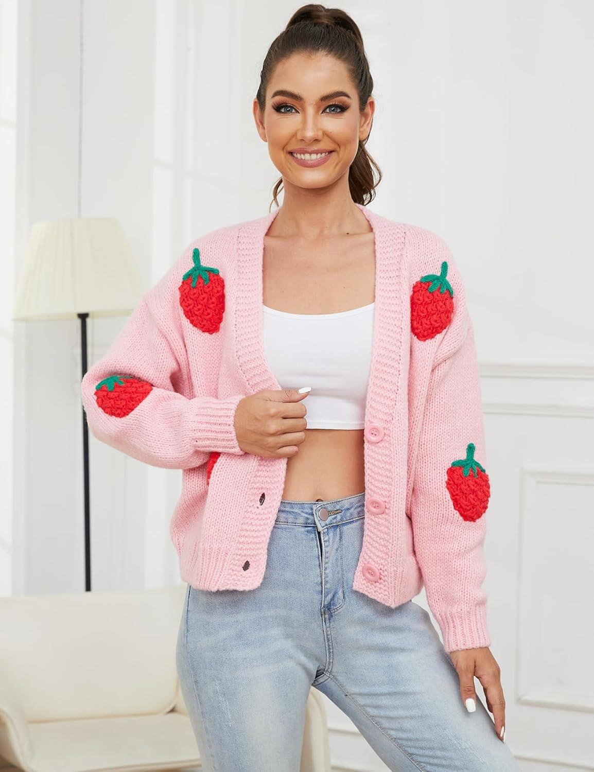 Arssm Women’s Strawberry Embroidery Cardigan Sweater Cute Kawaii Button Down Long Sleeve V Neck Crop Shrug Sweaters(Pink-M)