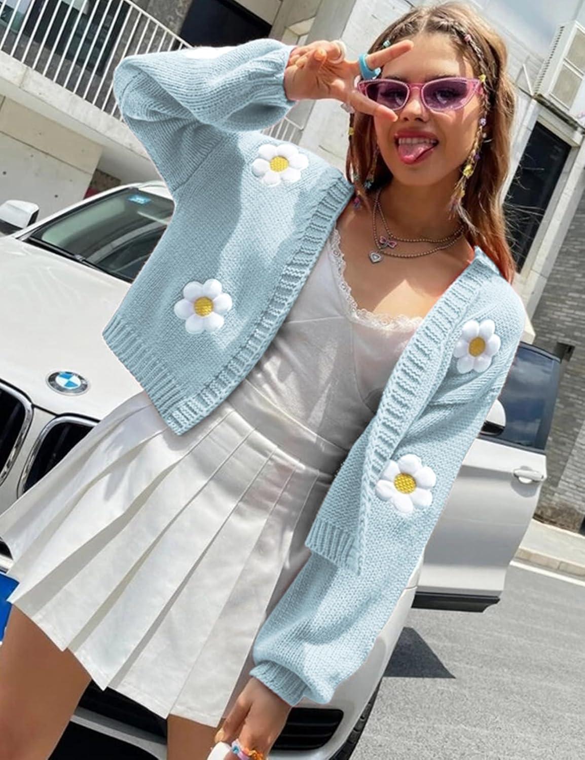 Arssm Y2K Womens Flower Cardigan Sweater Long Sleeve Knit Cropped Cardigan Open Front Cute Shrug Fall Sweater 90s Outfits(Blue)