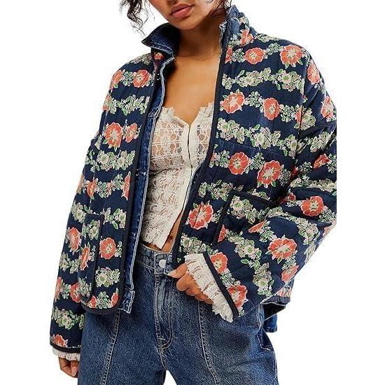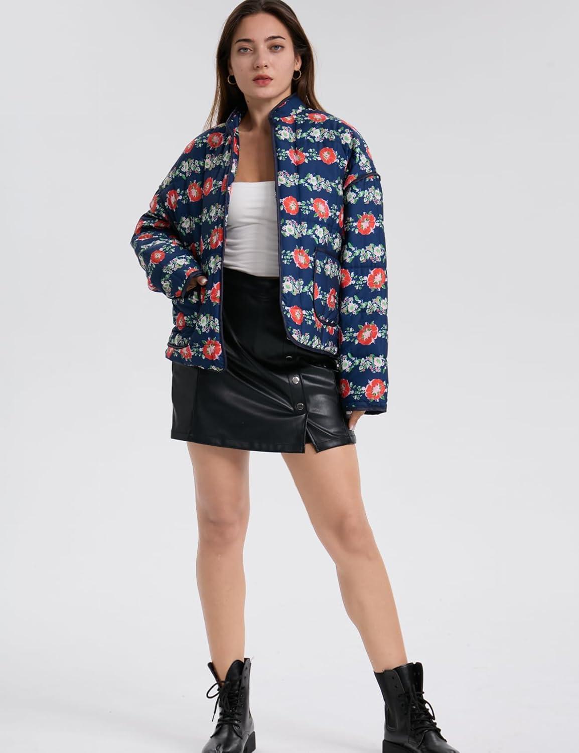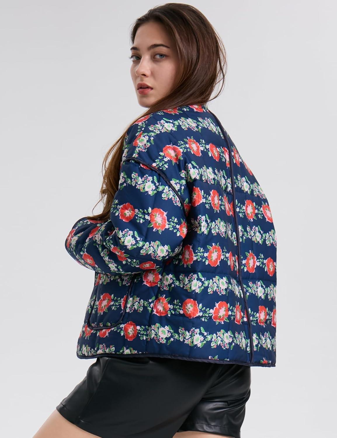 Women’s Cropped Puffer Quilted Jacket Lightweight Long Sleeve Padded Floral Print Puffy Cardigan Outwear Coat(Navy)